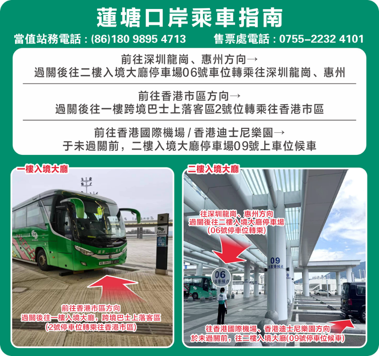 地址: 1、前往惠州、龍崗方向:過關後往二樓入境大廳停車場21/22號車位轉乘往惠州、龍崗 2、前往香港市區方向:過關後往一樓跨境巴士上落客區2號位轉乘往香港市區 3、前往香港國際機場/香港迪斯尼樂園方向:未過關前,二樓入境大廳停車場5號上車位候車