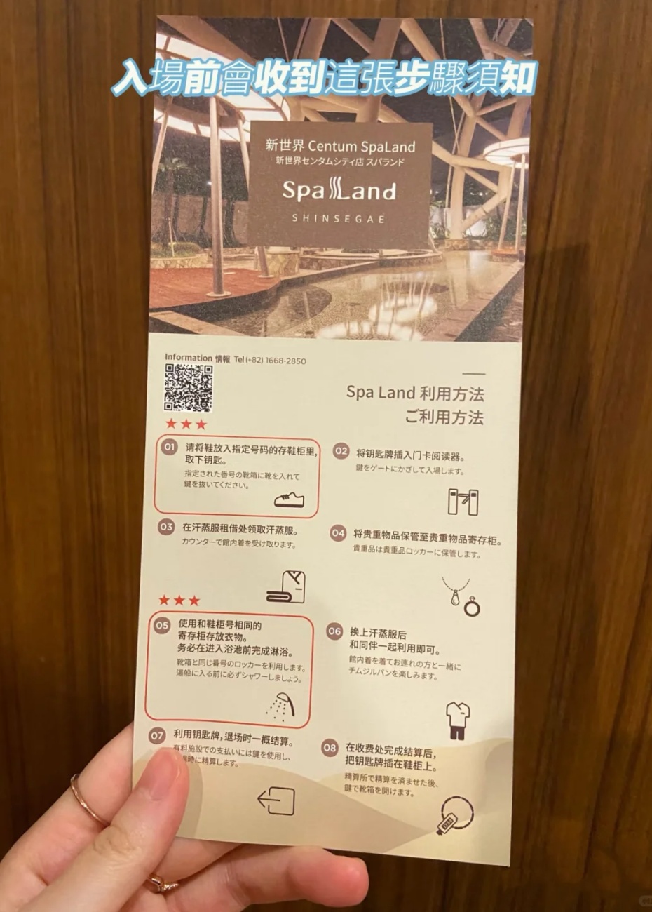 • 入場與儲物:在前臺兌換門票,領取號碼牌、儲物手環、汗蒸服和兩條毛巾(洗澡1條,汗蒸擦汗/拍照用1條)。