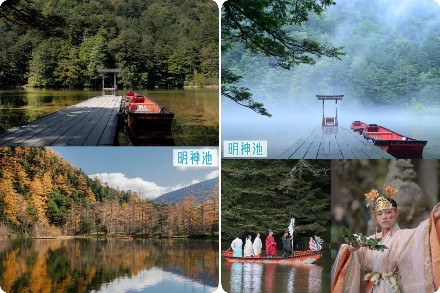 位於穗高神社奧宮的境內,池水源自明神嶽的伏流水,周圍被落葉松林環抱。每月10月8日會舉行「明神池禦船祭典」,雅樂回蕩,仿佛穿越時空的平安繪卷。