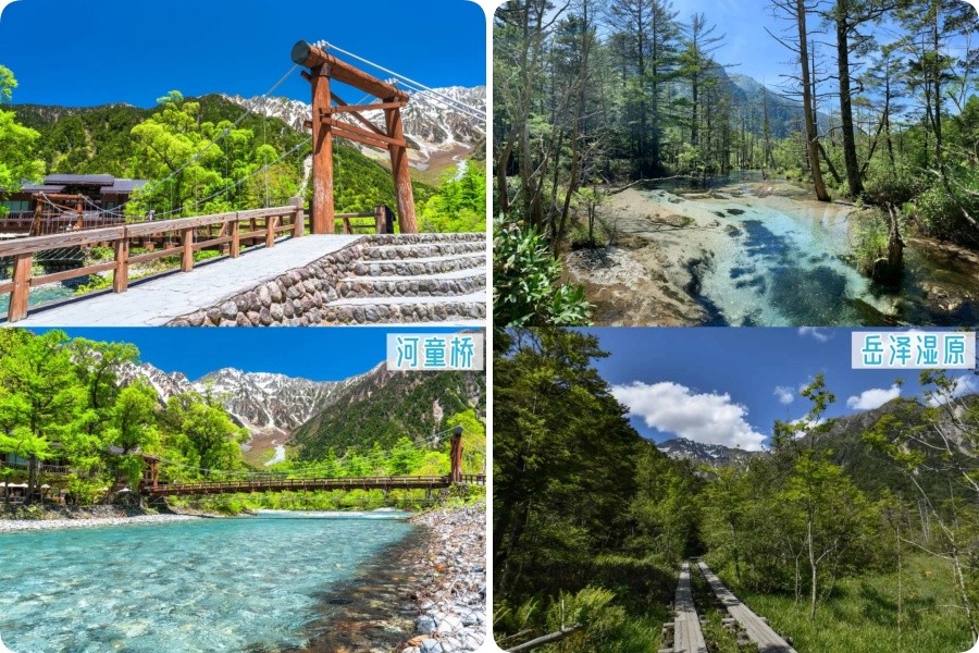 這裏是上高地的絕景地標。木製吊橋橫跨梓川,融入山林河流間,可遠眺穗高連峰與活火山。