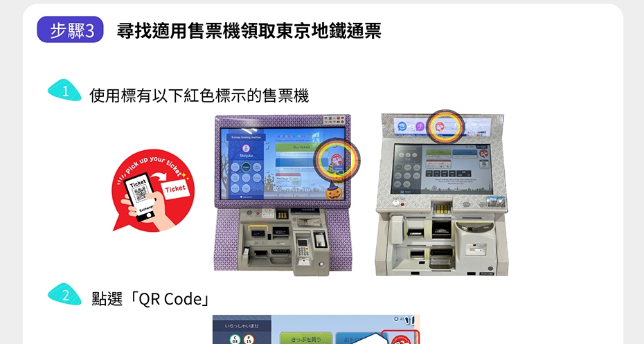 東京地鐵通票:需在東京地鐵線、都營地鐵線的任意車站售票機,憑電子憑證中的單個二維碼,為同一訂單的所有旅客兌換實體通票(兌換後通票需在首次使用時插入閘機激活,激活後開始計算有效期)。