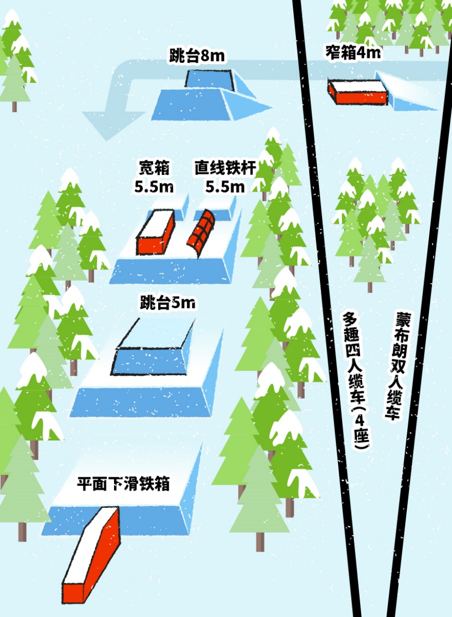 在滑雪項目上,以跳臺、鐵箱、鐵桿為中心將繼續增加項目種類。現在在雪上公園周邊設置了兩臺降雪機以便能夠充分使用降雪,直到本季度最後階段也可保持良好的滑雪狀況。