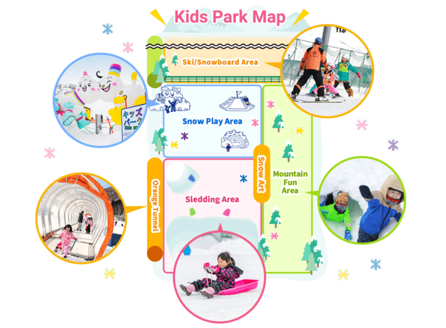 第一次玩雙板滑雪板和單板滑雪板的孩子們也可以安心!孩子們可以先在兒童遊樂區旁邊的雙板滑雪板和單板滑雪板雪區練習, 熟悉雪地,慢慢習慣!一旦學會,就可以轉戰其他的滑雪道了!