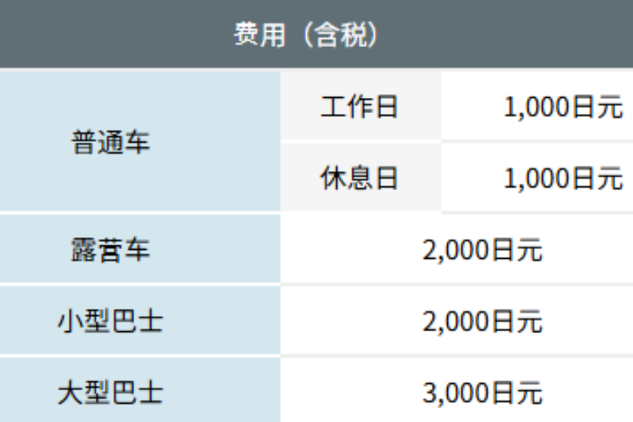 ※露營車、小型巴士、大型巴士全天停車均為相同費用。