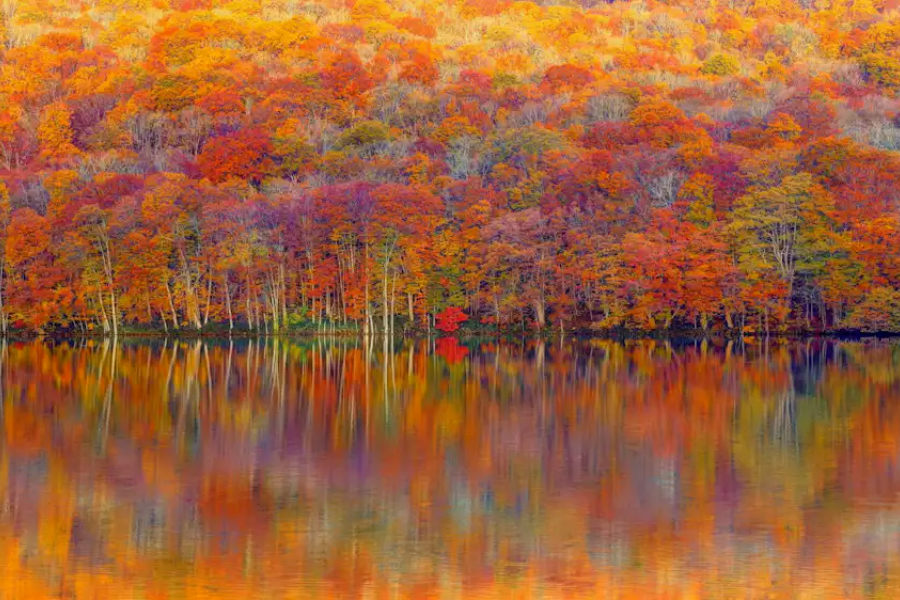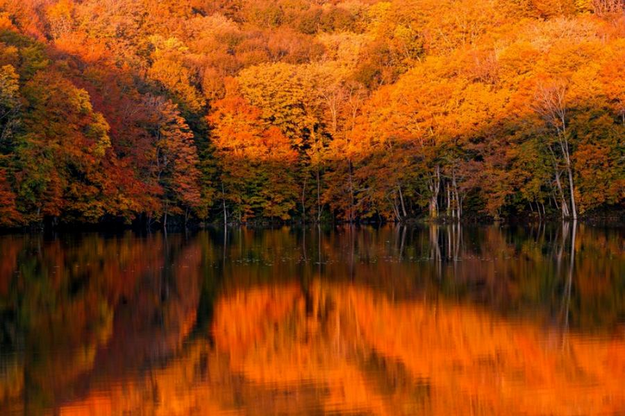 蔦沼位於青森縣十和田市,是奧入瀨區域的沼澤之一,被眾多的日本山毛櫸包圍,形成了一片被稱為“十和田樹海”的原生林。秋季時分,蔦沼的水面上,會倒映出紅葉的美景,尤其在日出時刻,景色宛如水面上的紅葉在燃燒,非常壯觀。