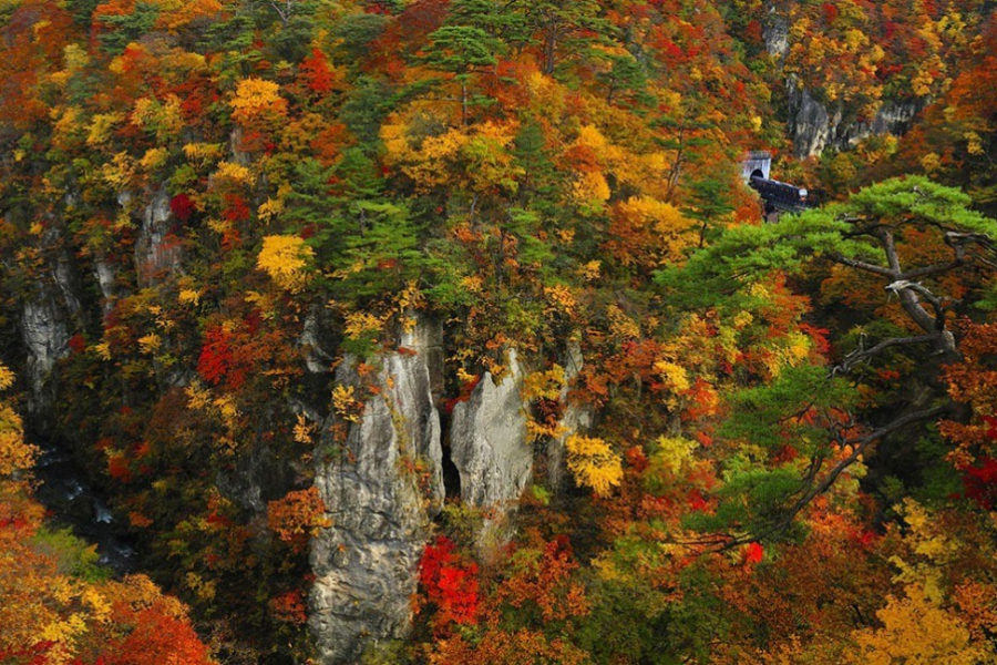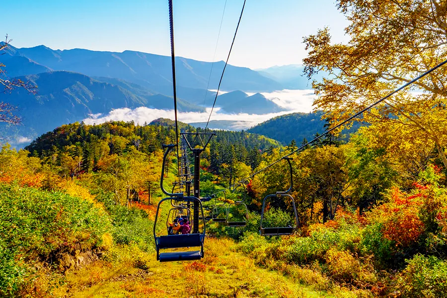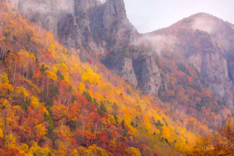 大雪山國立公園(層雲峽)是日本北海道著名的賞楓勝地,以其壯麗的自然風光和秋季的紅葉美景而聞名。層雲峽以其深邃的峽谷、清澈的溪流和豐富的植被而著稱。秋季時分,整個峽谷被染上了層層疊疊的紅色、橙色和黃色,構成了一幅動人的秋日畫卷。在大雪山國立公園內,可以遊覽黑嶽、銀河瀑布、層雲峽溫泉等多個景點。銀河瀑布是公園內的標誌性景觀,瀑布從高處飛瀉而下,與周圍的紅葉相映成趣。