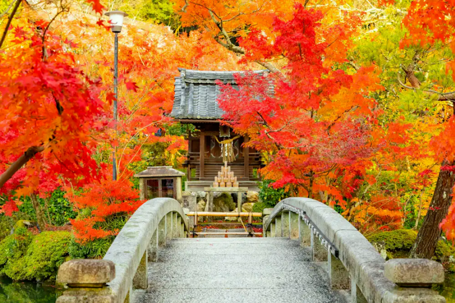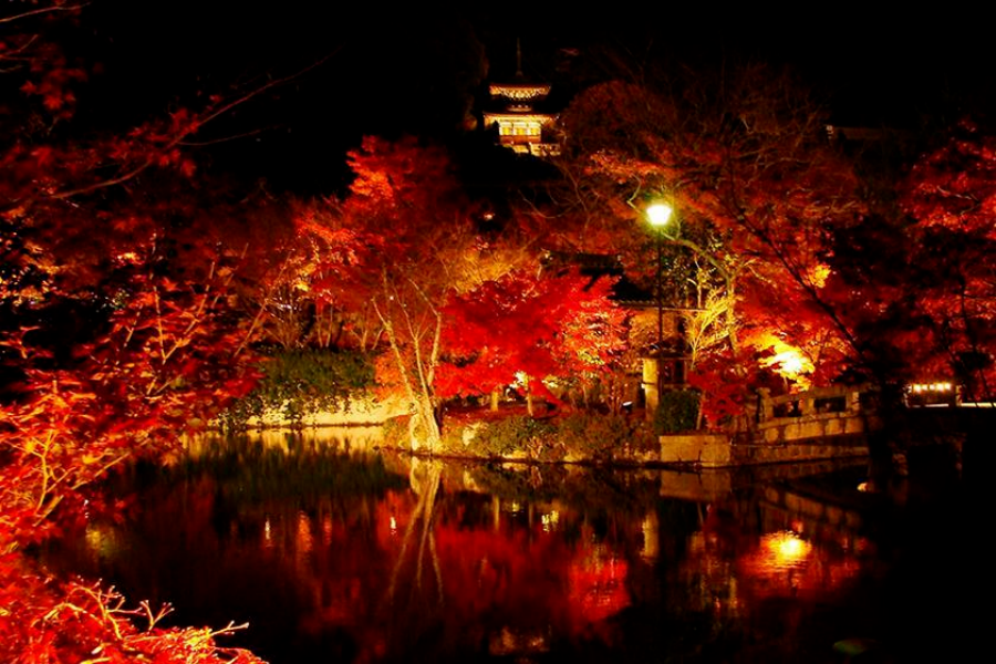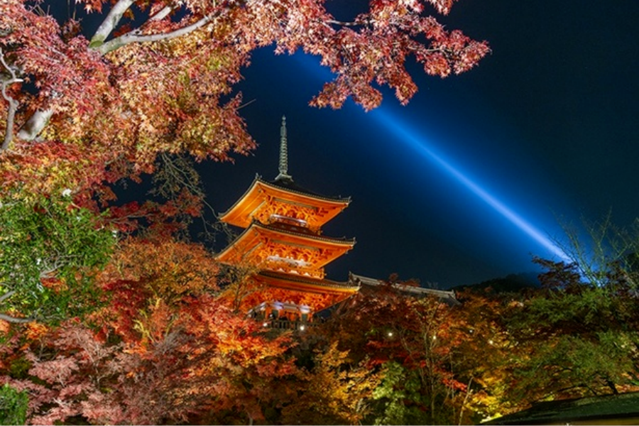 清水寺是京都的標誌性建築之一,從清水舞臺可以遠望被紅葉覆蓋的東山地區,感受清新空氣和經典的日本之秋。清水寺的最佳賞楓時期為11月下旬至12月上旬。此外,清水寺在秋季也有夜晚特別參拜活動,屆時點燈後的紅葉美景將更加迷人。