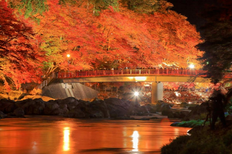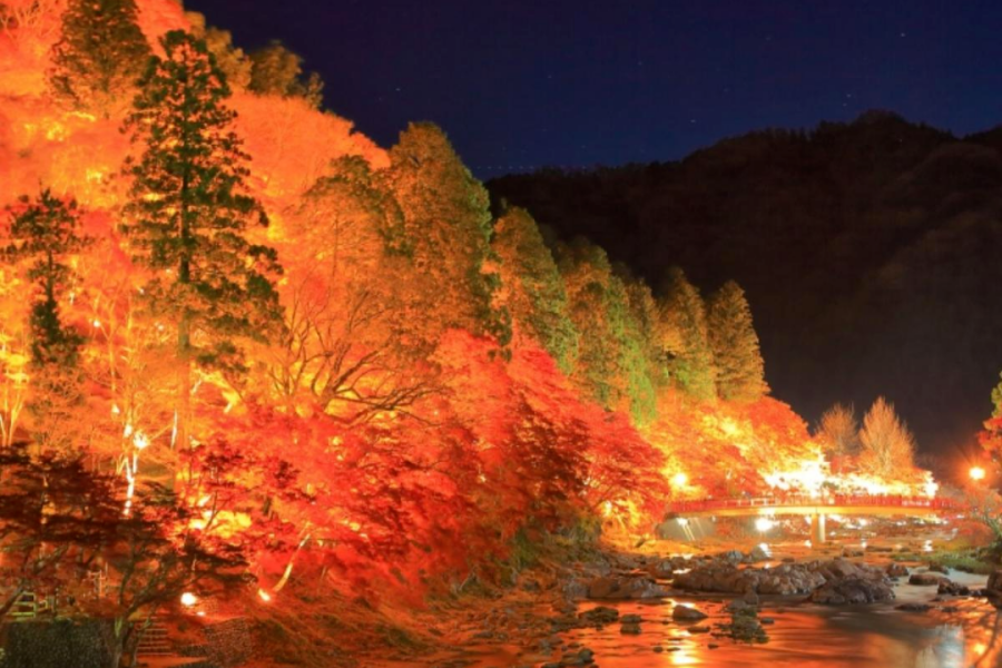 香嵐溪是位於愛知縣的著名賞楓景點,以其秋天紅葉成蔭和燈光秀美而聞名 。這裡擁有約4000棵楓樹,楓葉期間,整個山區的楓葉會一下子全部著色,形成一道紅黃相間的壯觀景色 。每年11月,香嵐溪還會舉辦紅葉節,期間有各種活動和夜間點燈,讓遊客體驗不同於白天的夢幻景色 。待月橋是香嵐溪的標誌性建築,這座硃紅色的橋樑橫跨在巴川上,是拍攝紀念照片的好地方。