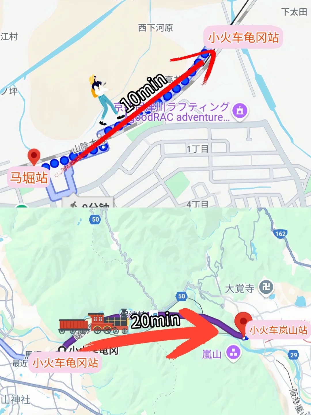 2️⃣ 嵐山站:坐上小火車,20分鐘的車程,沿途風景超級美,京都必打卡景點,超級出片🍁🌸
