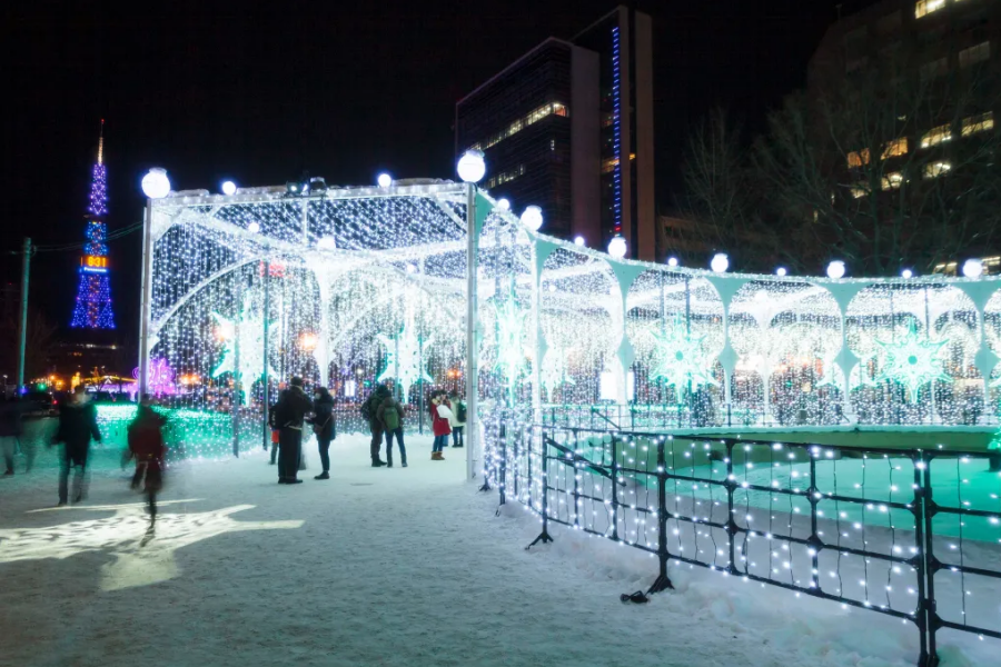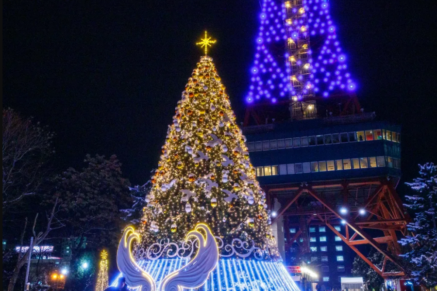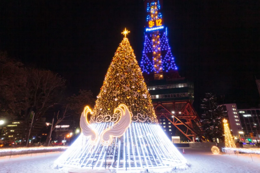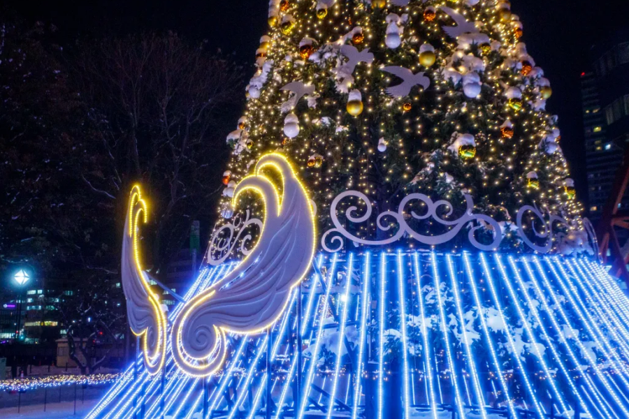 亮點:以札幌市鳥杜鵑為靈感的金色帶翼裝置,是會場標誌性打卡點!今年新增東西兩大拍照點:西側裝置會隨著遊客站立位置變換顏色,互動感滿分;東側則設置花環(門)造型裝置,適合拍攝全身照、情侶合照,定格冬日浪漫。