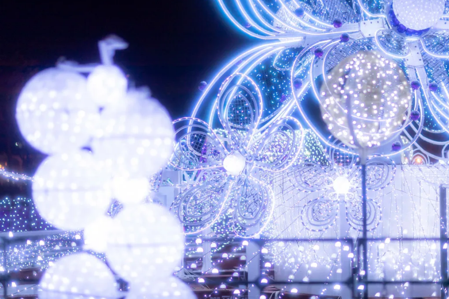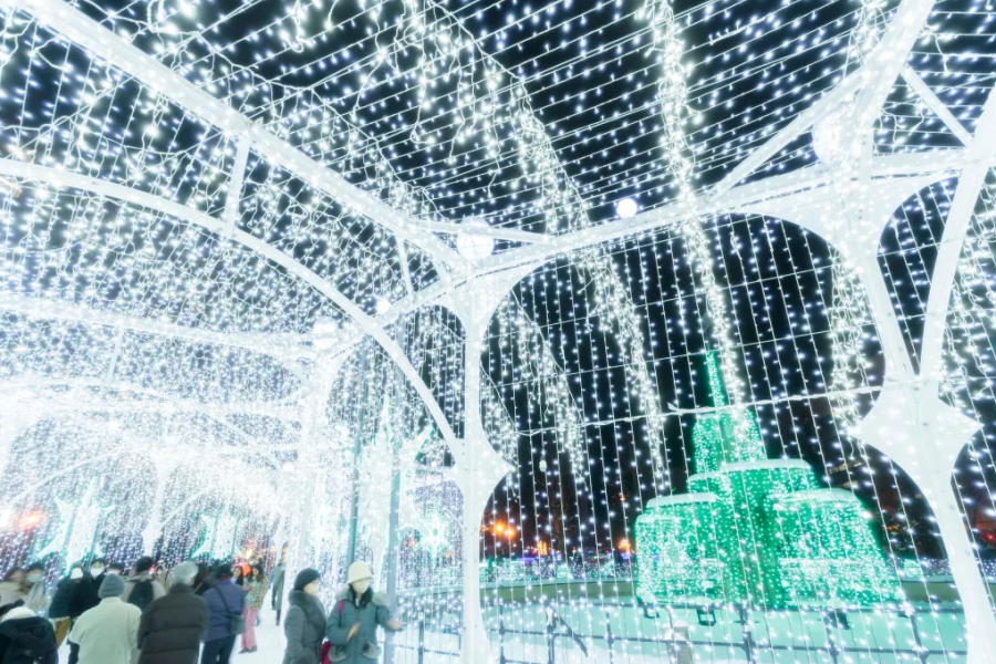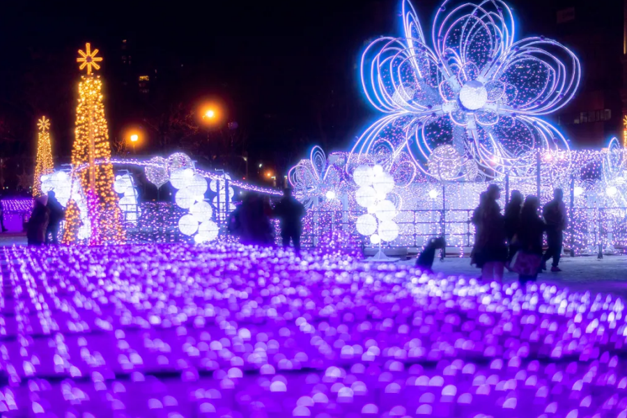 亮點:人氣紫丁香象徵物聯袂札幌之花鈴蘭、北海道之花薔薇果升級登場!燈光在紫、藍、紅等五種色彩間交替轉換,比往年更柔美絢麗。建議選擇側光角度拍攝,能清晰捕捉花瓣狀燈飾的層次感,色彩飽和度超適合朋友圈打卡。