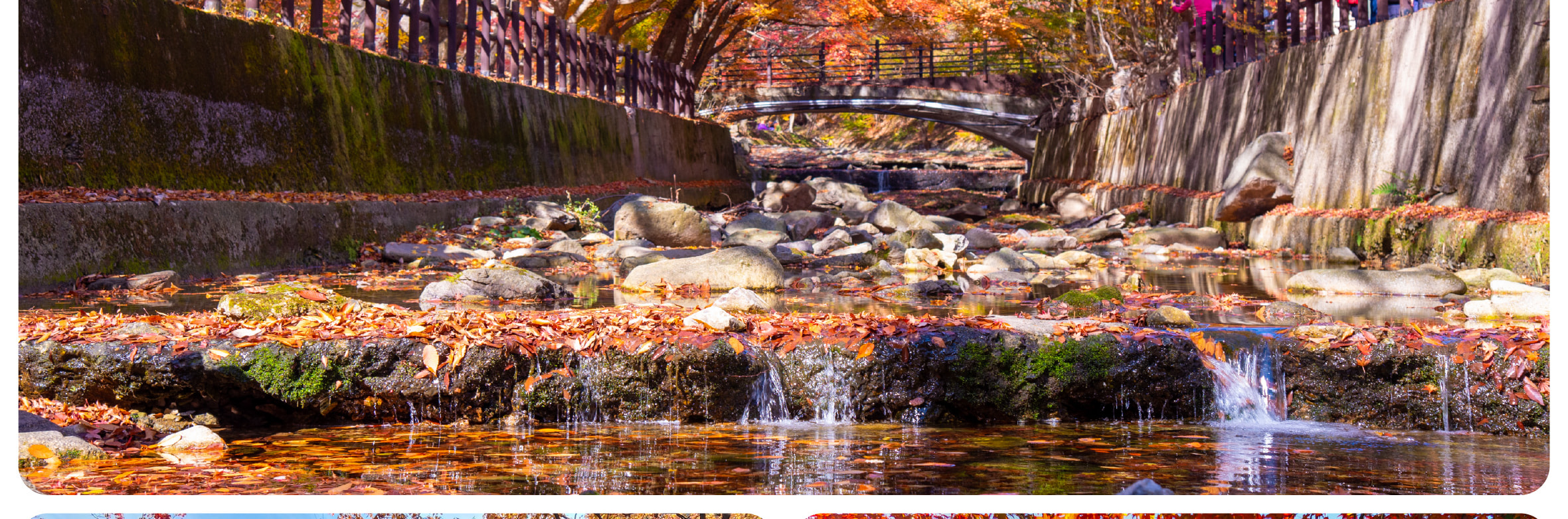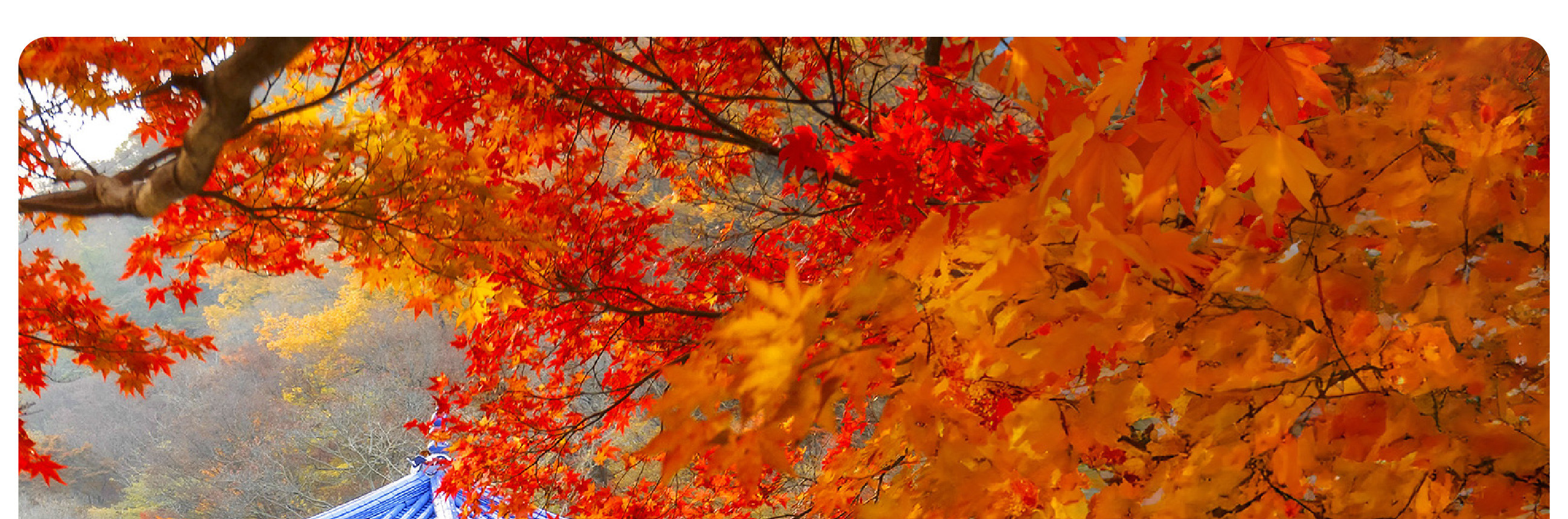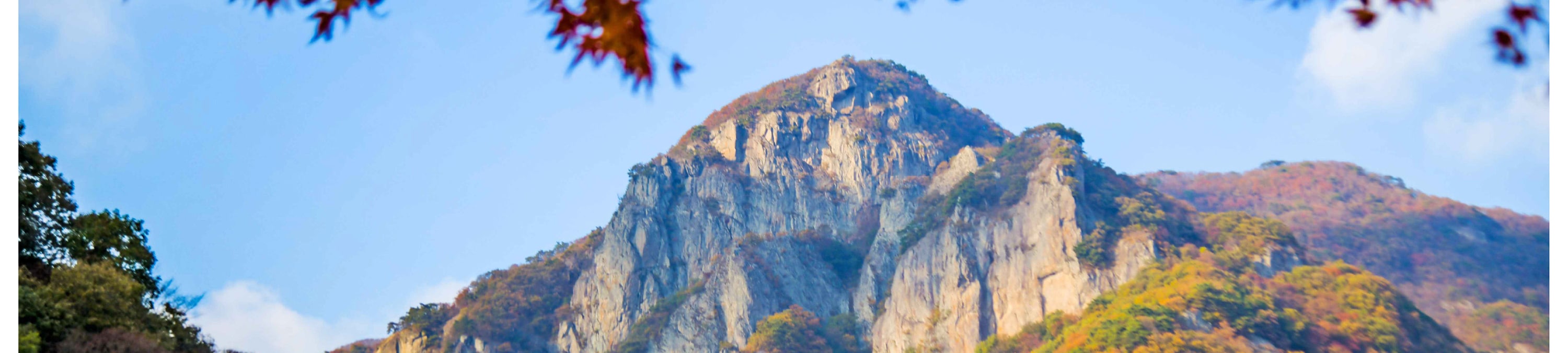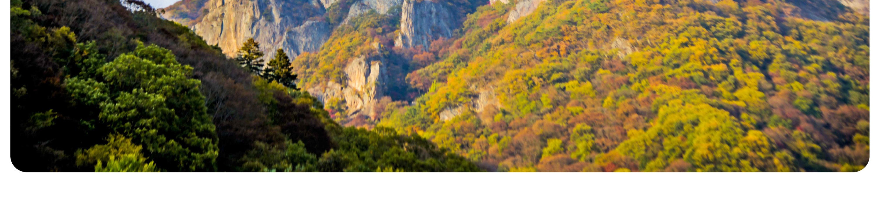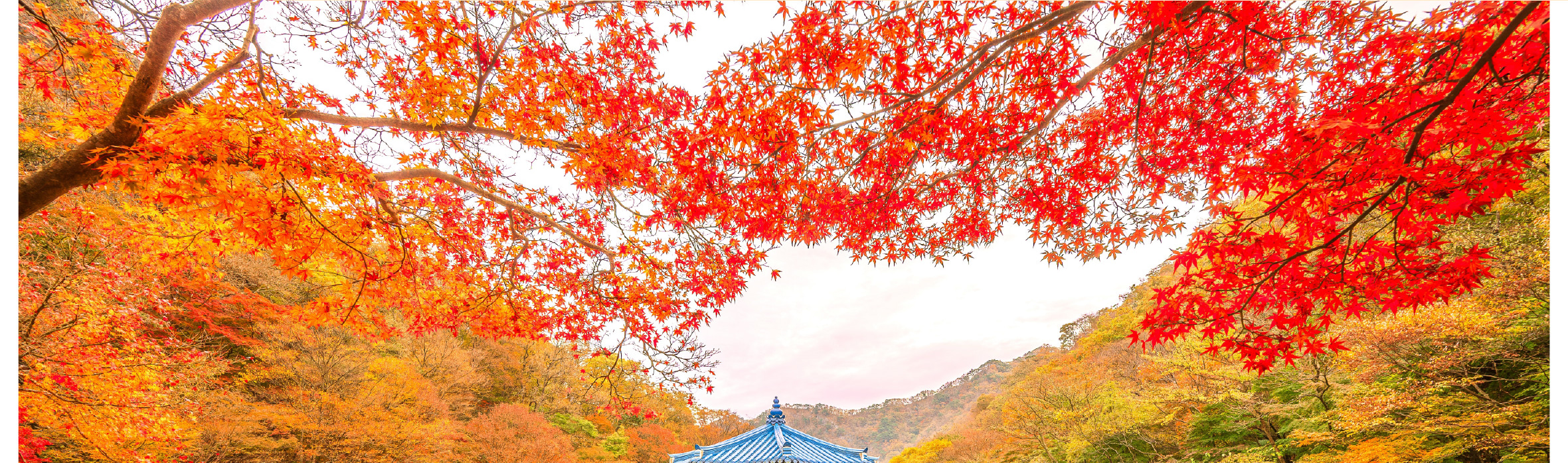 踏入內藏山國立公園,首當其沖的是金剛窟峽谷的 「楓葉隧道」。百年楓樹沿溪谷垂落,紅葉與碧綠潭水相映成趣,陽光穿透葉隙在石階上投下斑駁光影,徒步其間如穿行油畫卷軸。登上海拔 807 米的丹楓閣,俯瞰層巒疊嶂的 「楓海」,赤紅、橙黃、絳紫在山脊間鋪陳,與遠處內藏寺的青瓦飛檐相映成趣,這份兼具自然野趣與禪意的景致,正是內藏山區別於其他賞楓地的精髓。