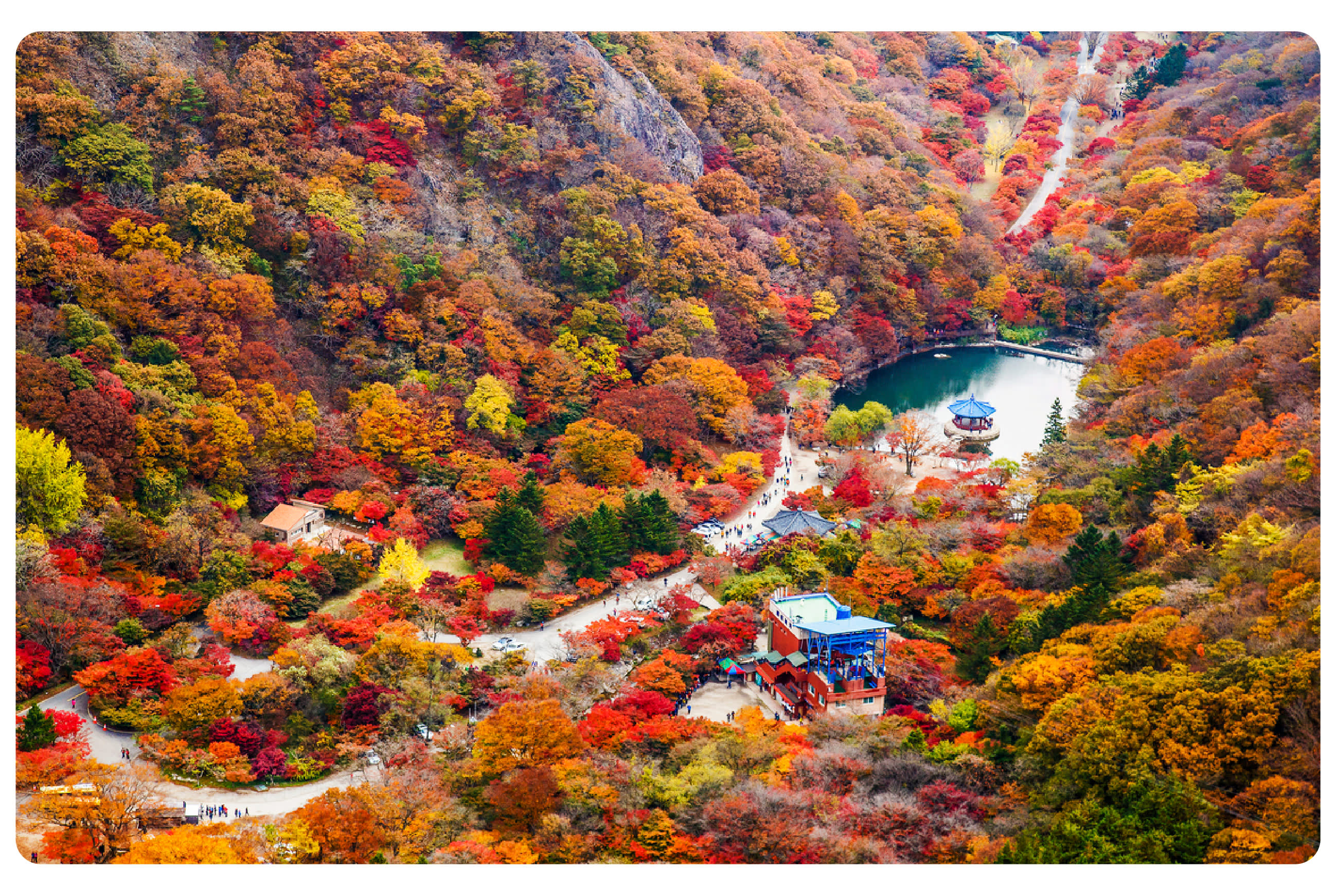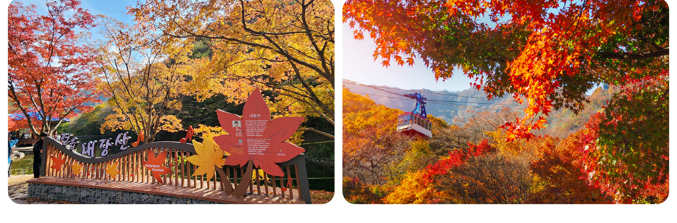 內藏山的貼心設計讓賞楓毫無門檻:無障礙步道貫通主要景點,老人與孩童可輕松抵達最佳觀景點;山腳下的楓葉村聚集著傳統韓屋民宿,夜晚燈籠與紅葉相映成詩;每年 10 月下旬至 11 月的 「內藏山楓葉節」 更有傳統農樂表演,讓遊客在賞楓之余深度感受韓國秋韻。當別處的楓葉還在醞釀時,內藏山已用 40 萬㎡的絢爛,為秋日旅行寫下最動人的註腳。