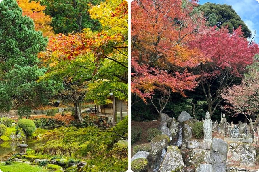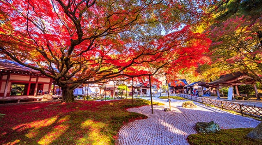 欣賞1300年歷史的古剎千如寺與紅葉形成鮮明對比的美麗景色。