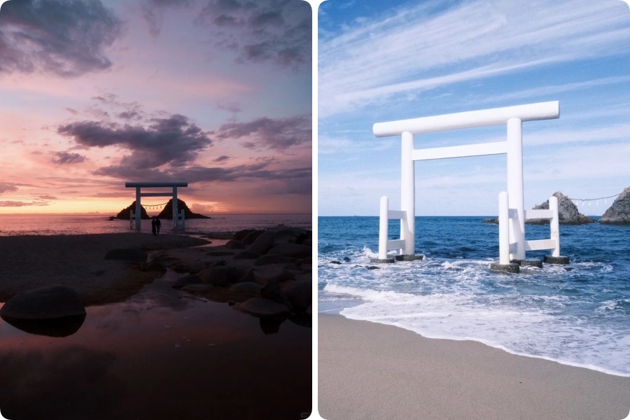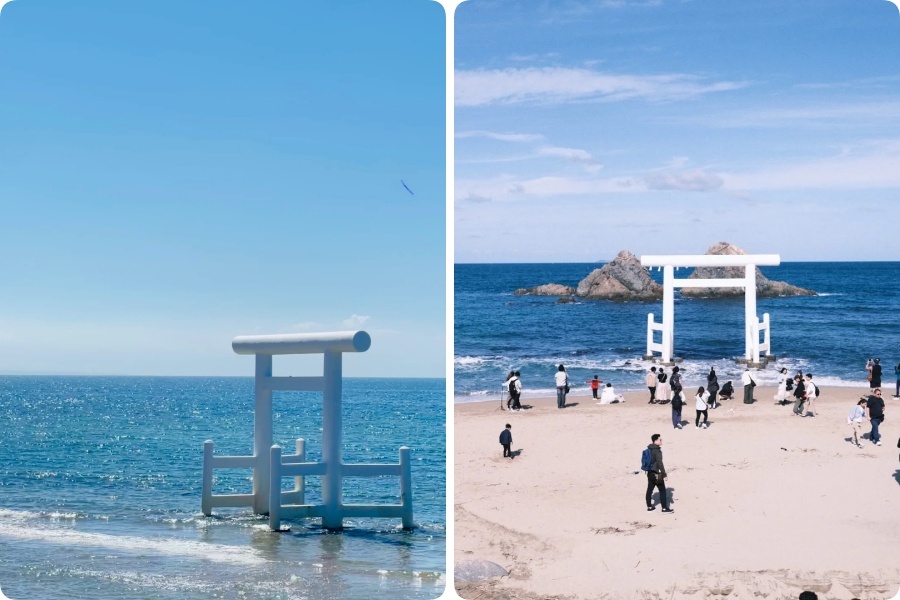 純白鳥居和大海之間的對比非常美麗,是很受歡迎的拍照景點。