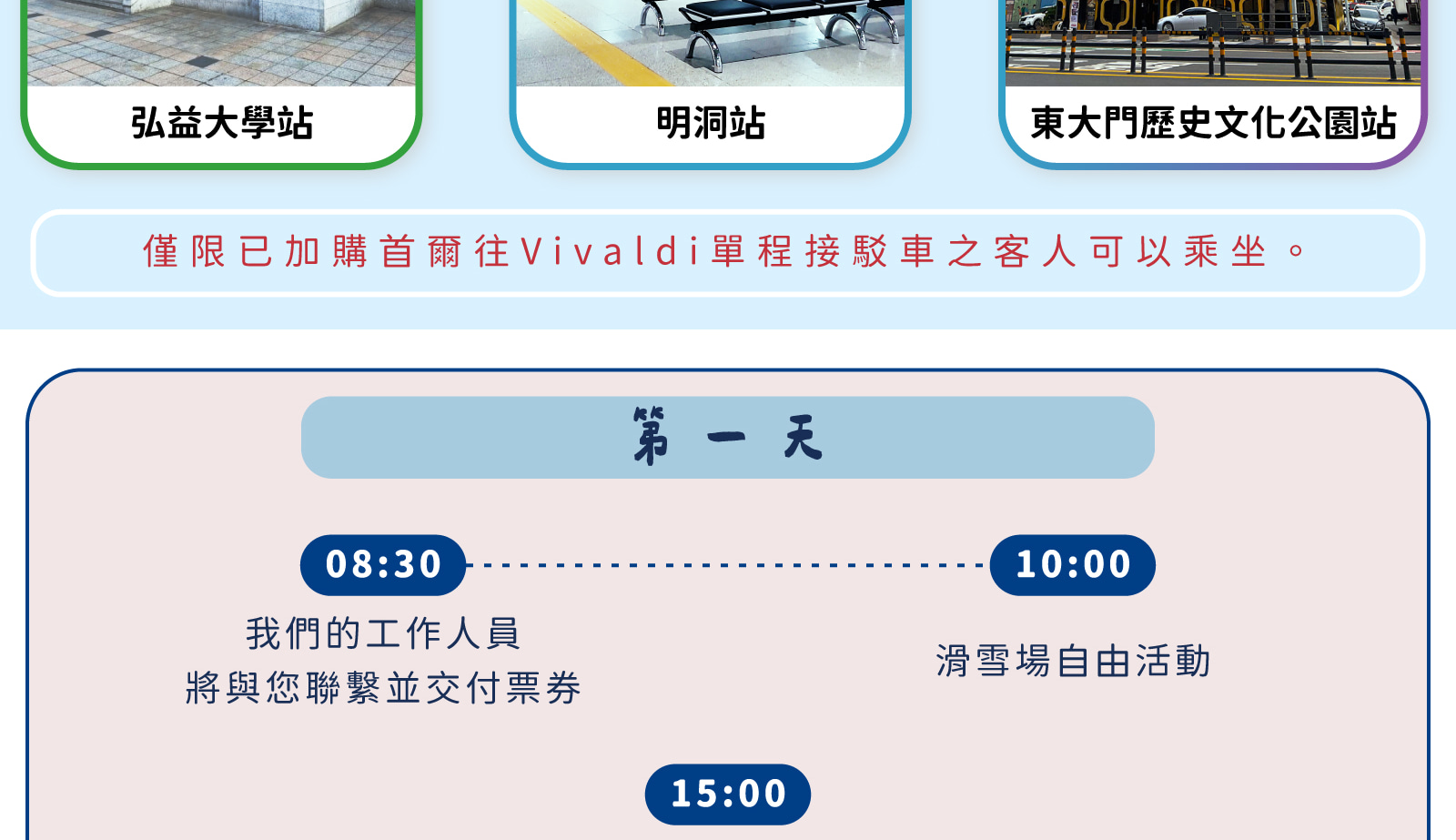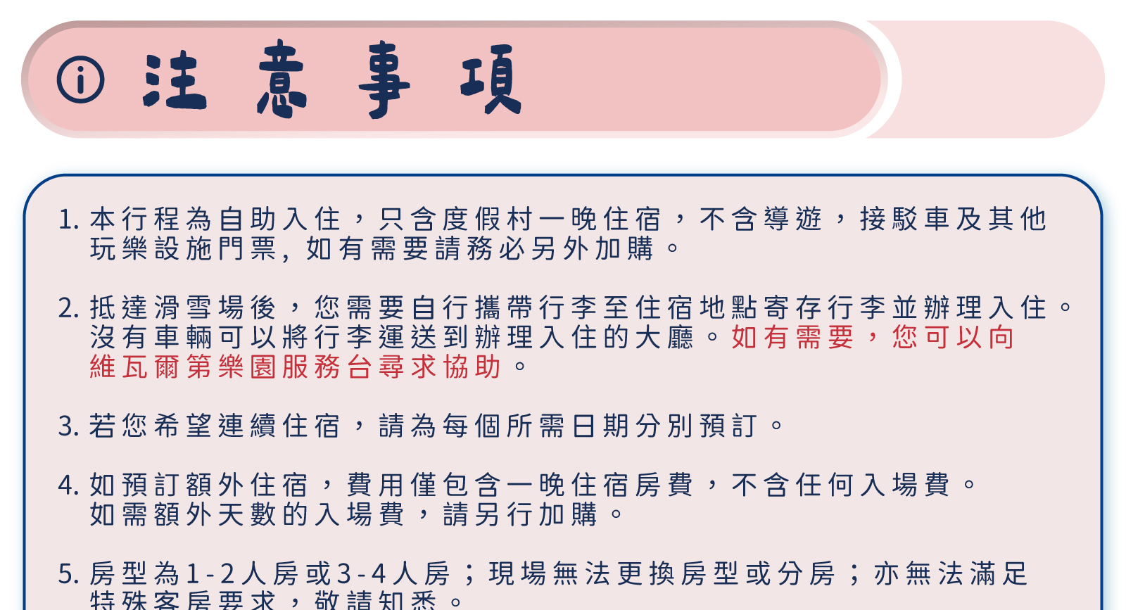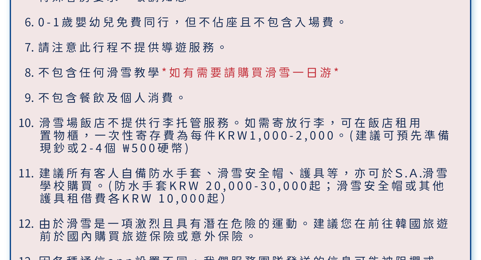 無法在非週末 / 非國定假日出發的遊客應注意,週末可能會遇到交通擁堵或滑雪勝地擁擠等問題。對於因遊客選擇週末 / 國定假日旅遊而產生的任何問題,本公司概不負責。
