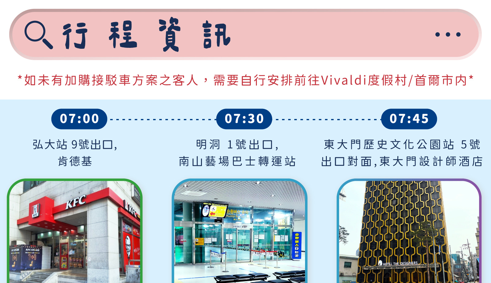 本行程將根據參加人數分配接載車輛:13人以下使用Solati / Starex,20人以上使用迷你巴士/旅遊巴士。**如有攜帶嬰兒車/輪椅/大型手提包,請告知我們。