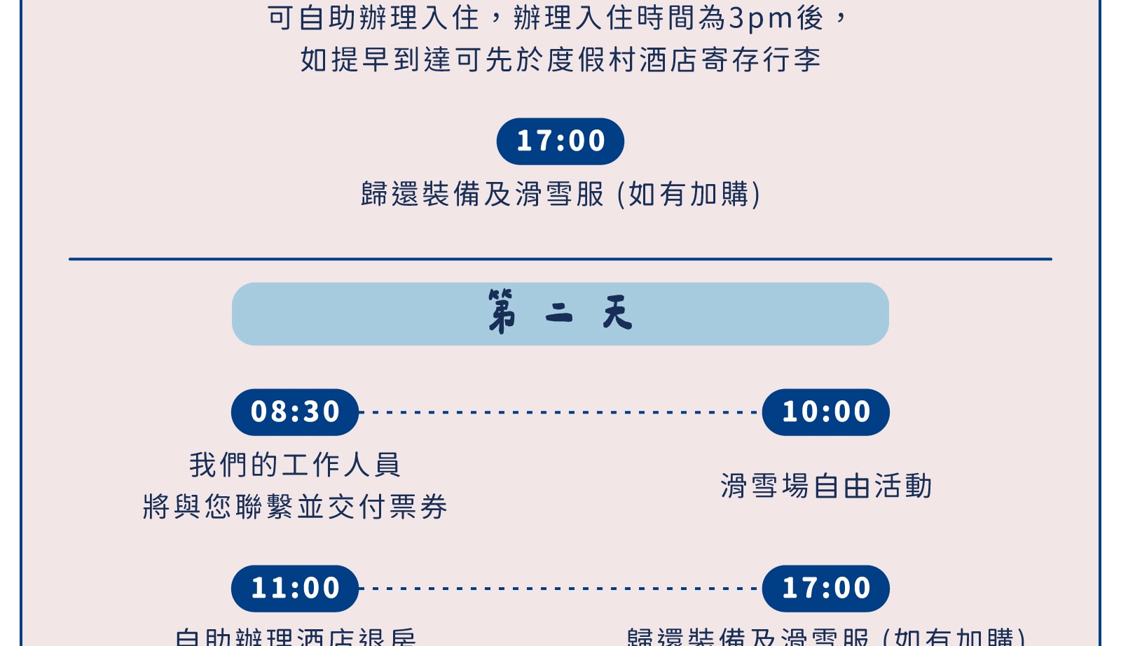 *請注意,本產品為自助辦理入住。抵達滑雪場後,您需要攜帶行李到住宿地點寄存行李並辦理入住。沒有車輛可以將行李運送到辦理入住的大堂。