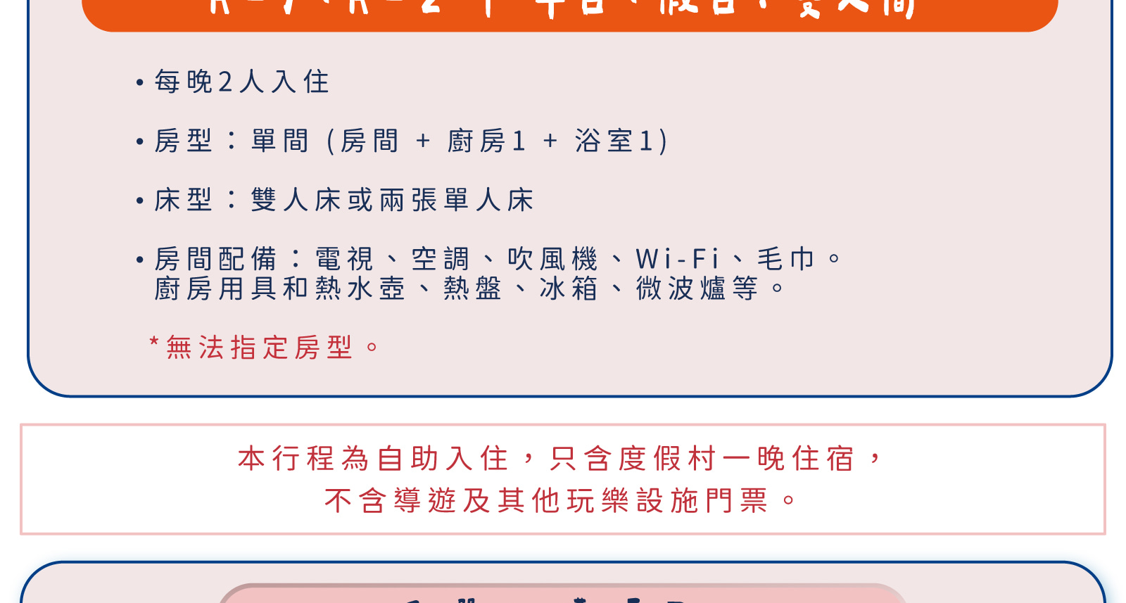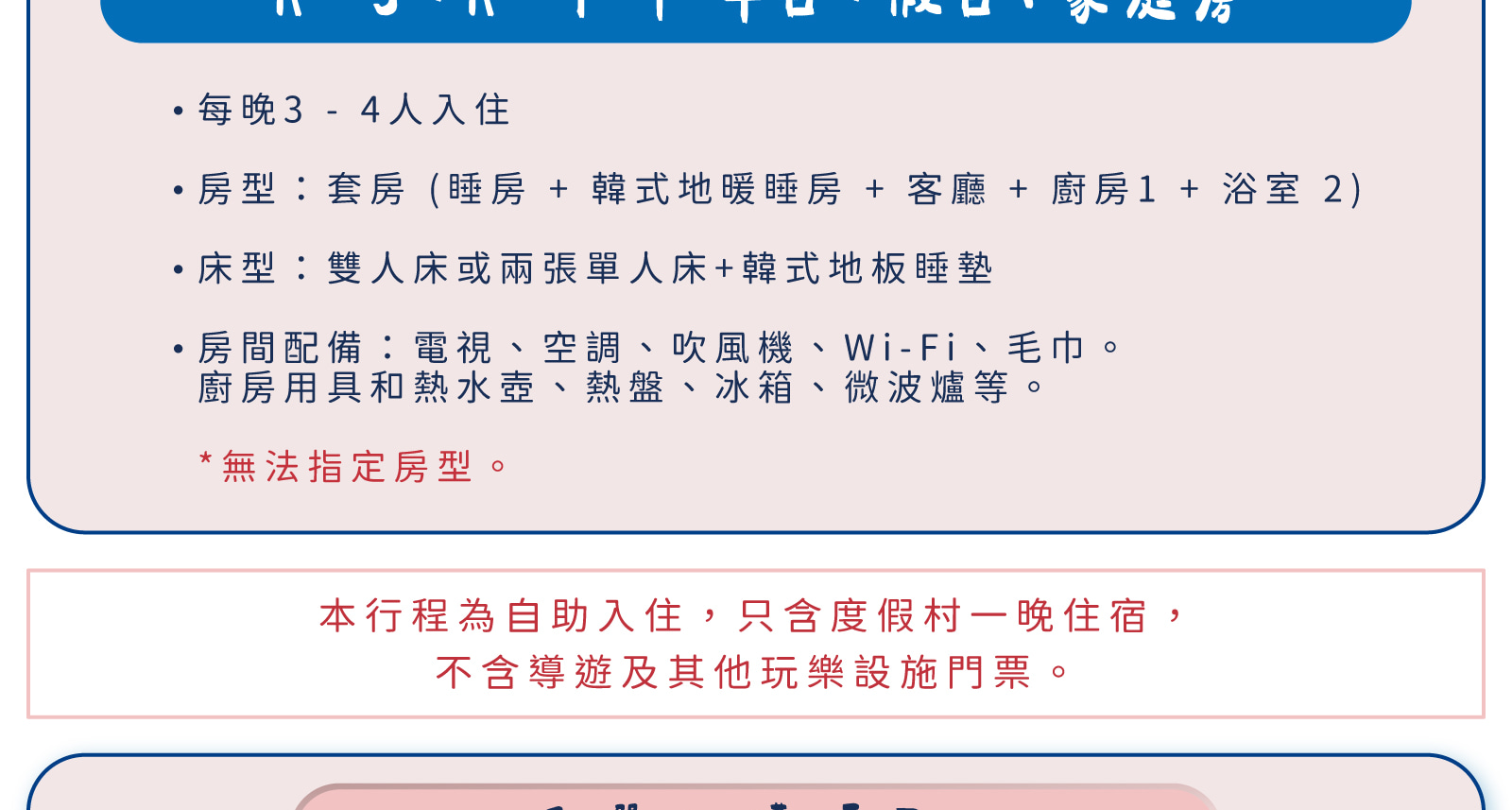 【請注意:】本產品僅包含度假村的一晚住宿。不包含交通、導遊服務和門票。只有購買了接駁巴士選項的遊客才能搭乘接駁巴士。未購買接駁巴士服務的旅客,須自行安排前往度假村的交通方式。