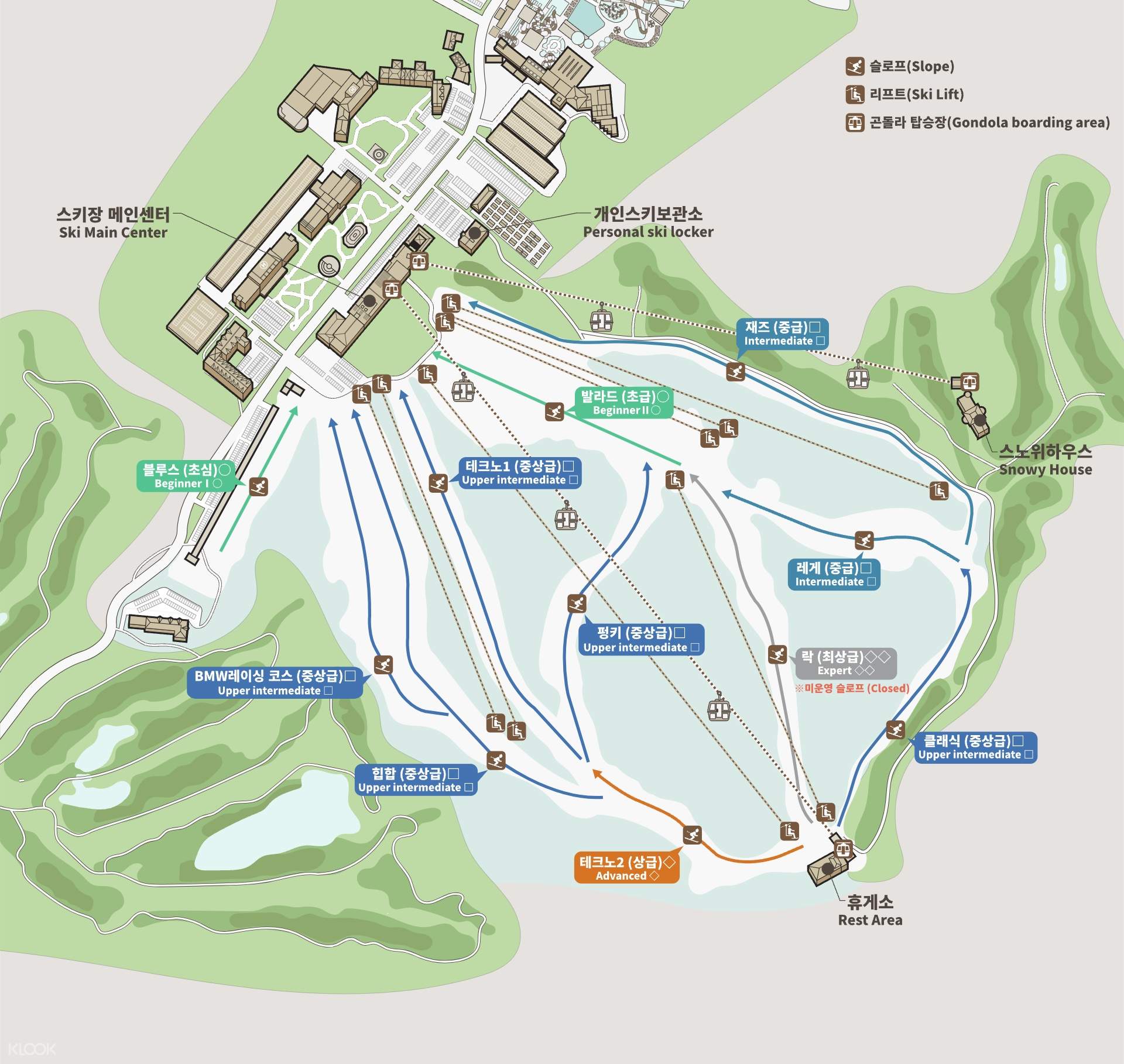 我們建議您攜帶防水手套、滑雪頭盔和運動護具。以下商品也可在滑雪學校購買:防水手套:20,000 - 30,000 KRW起,滑雪頭盔或運動護具租賃:每件10,000 KRW。