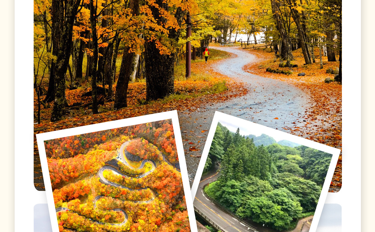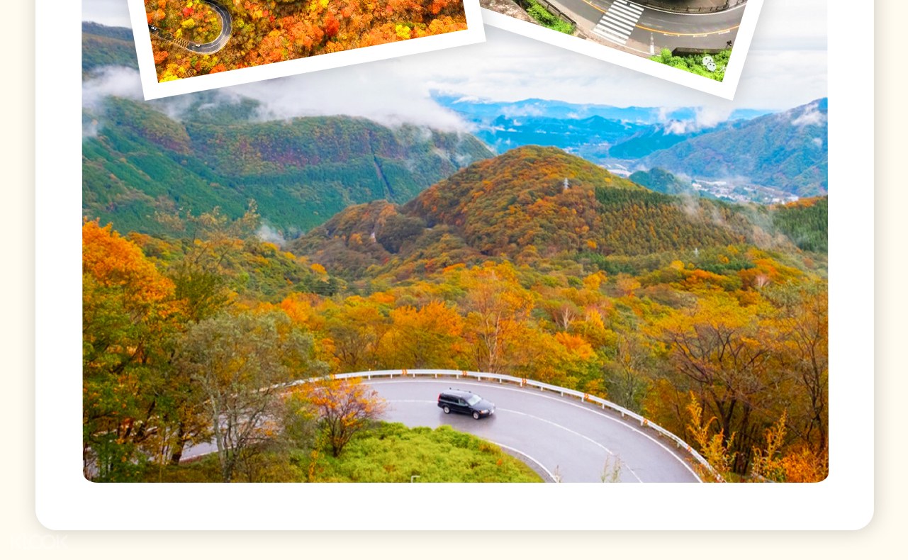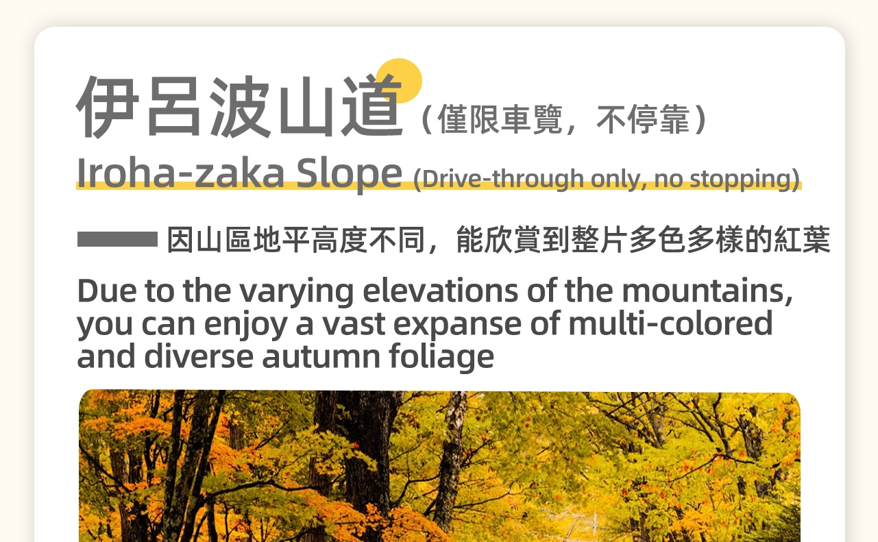 第二站:伊呂波山道(車覽不下車) 日本傳奇盤旋公路。因48個髮卡彎對應日語48字母得名。秋季整條公路化作赤金交錯的立體畫廊,被評為「全球最美秋色公路」之一