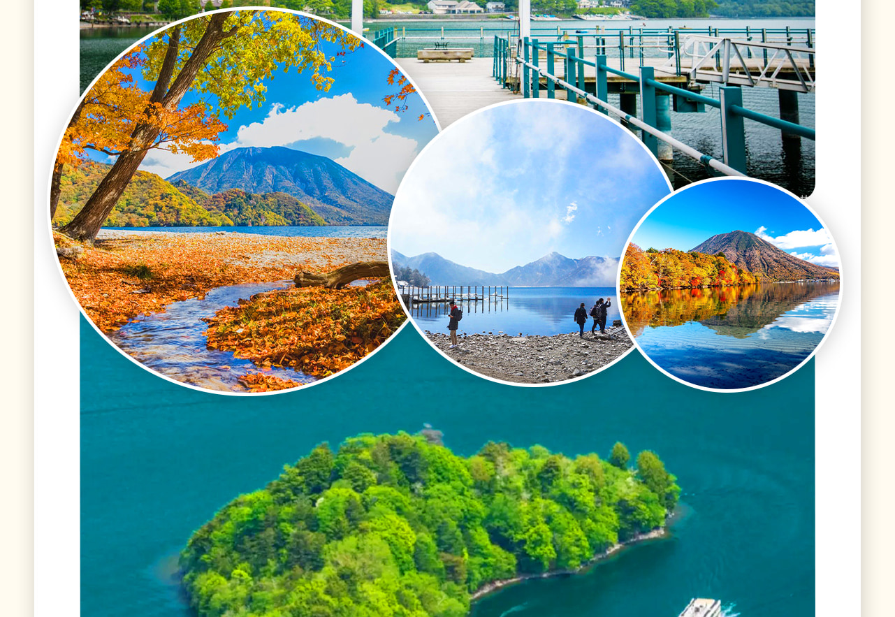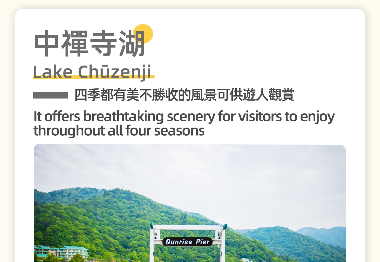 第三站:中禪寺湖 是日本最高火山湖。春天的杜鵑、夏天蔥綠的樹木、秋日的紅葉,冬天的雪景,四季皆景。傳說湖底沈沒著古代神社,霧氣瀰漫時宛如《幽靈公主》幻境