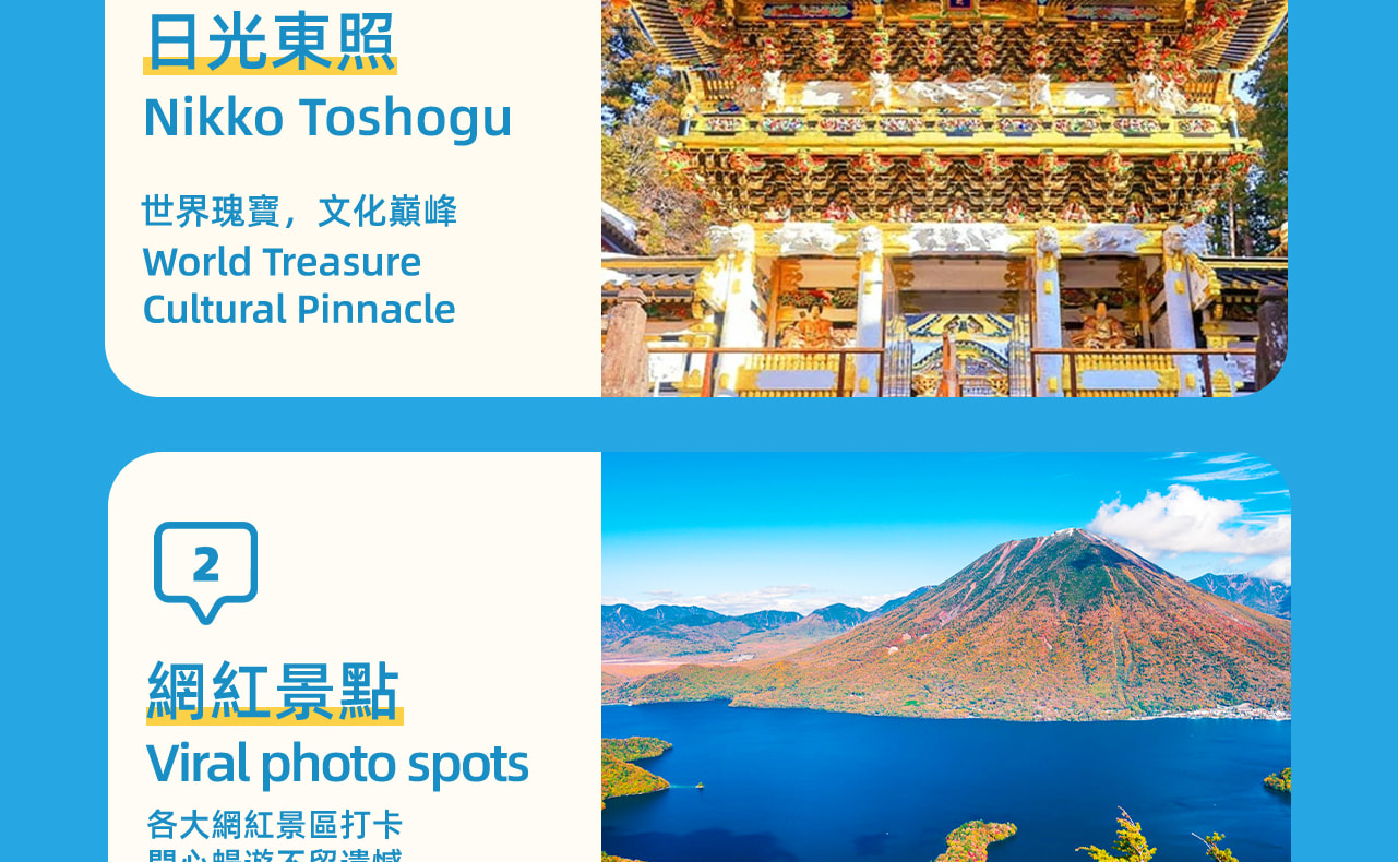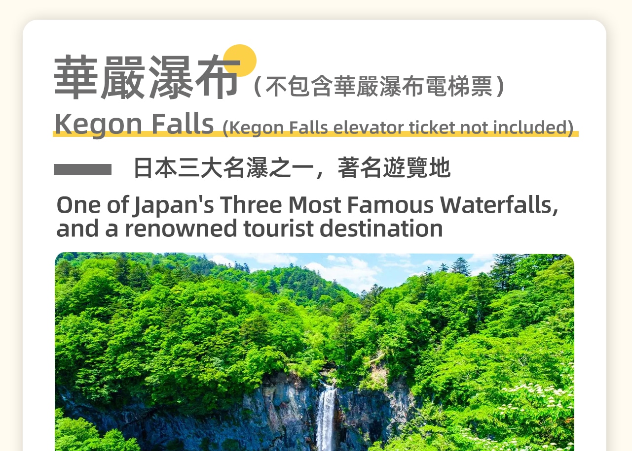 【費用不含】:景點門票:東照宮門票、華嚴瀑布電梯票、住宿、餐食及飲料、其他個人消費、小費、保險