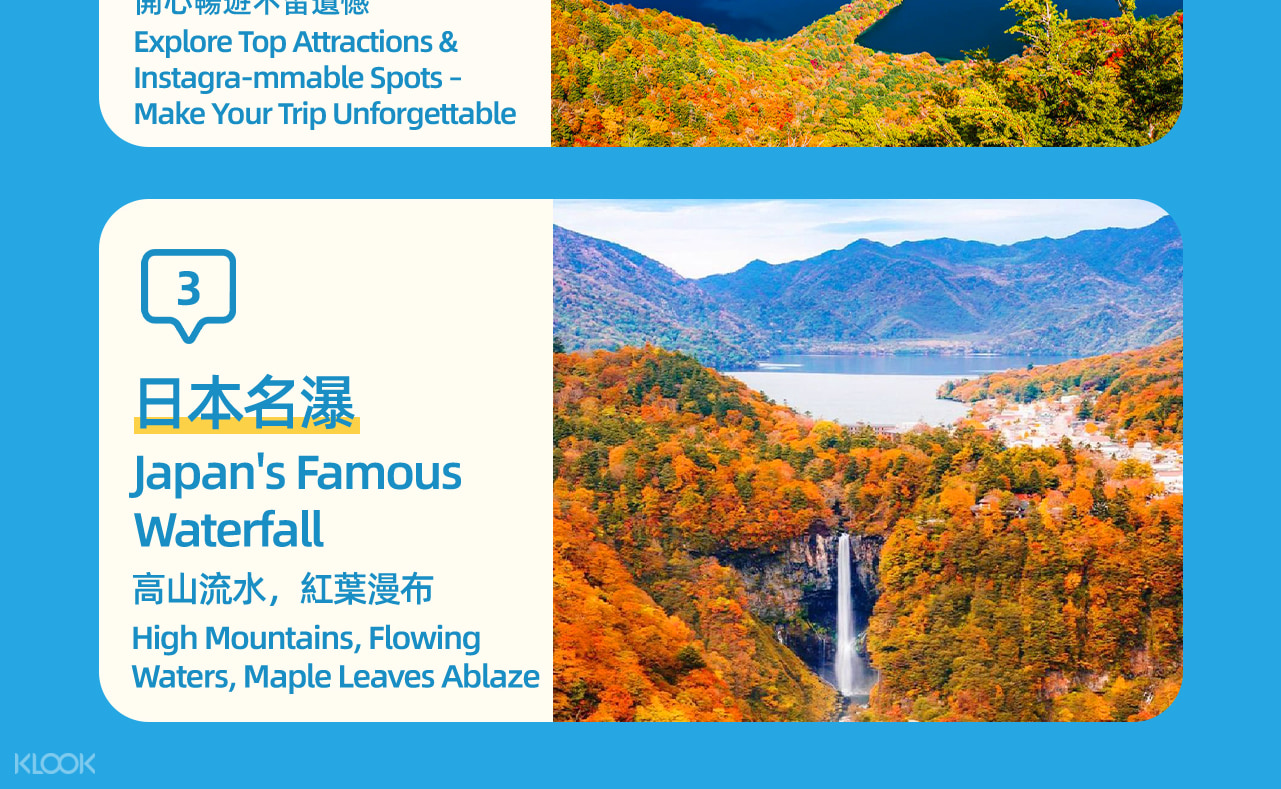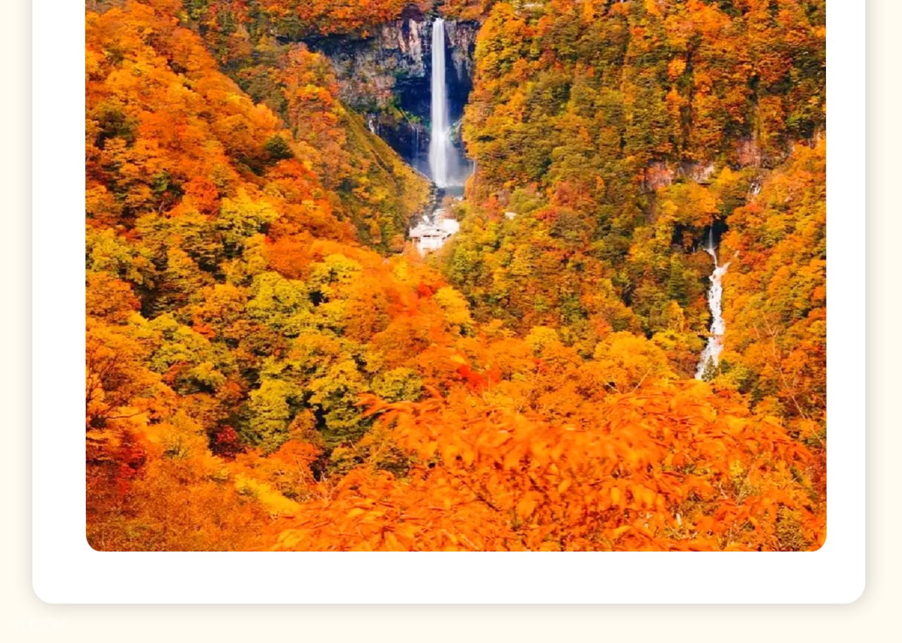 第四站:華嚴瀑布 日本三大名瀑之一。中禪寺湖水從百米斷崖轟然傾瀉,飛濺水霧在陽光下折射出永恆彩虹 冬季另有奇觀:寒流將瀑布凍結成巨大冰柱,夜間燈光下流轉幽藍幻光,與湖畔雪松構成超現實場景。作家德富蘆花曾嘆此景為「天地憤怒的具象化」