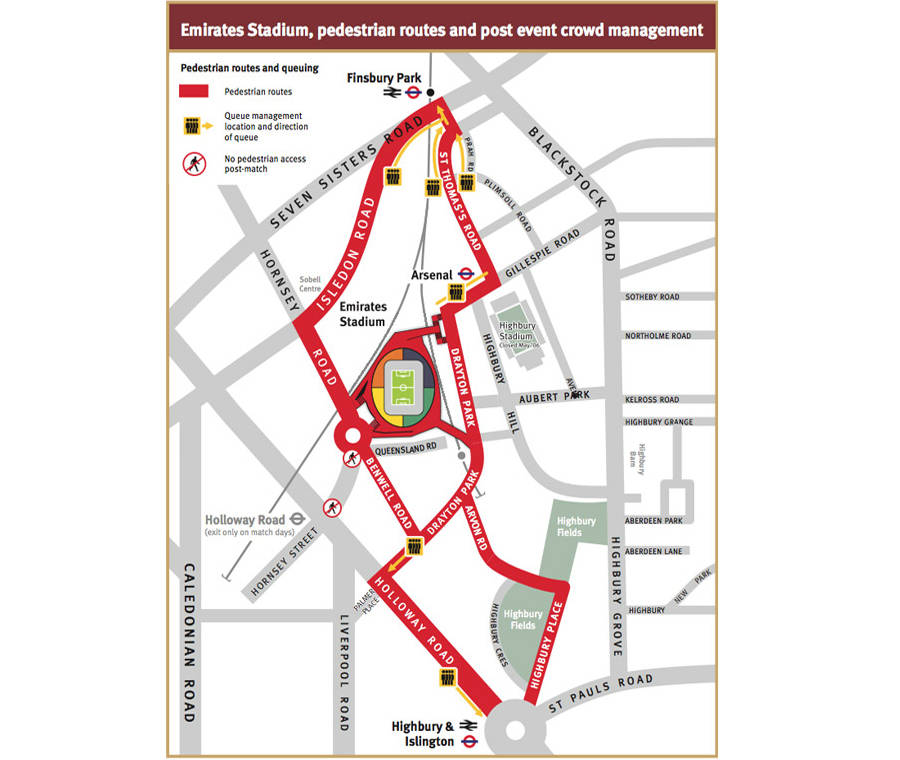 火車:阿森納或霍洛威路站(皮卡迪利線);芬斯伯裡公園站(維多利亞線、皮卡迪利線和Great Northern鐵路),以及海布里及伊斯靈頓站(維多利亞線、North London Line和Great Northern鐵路)