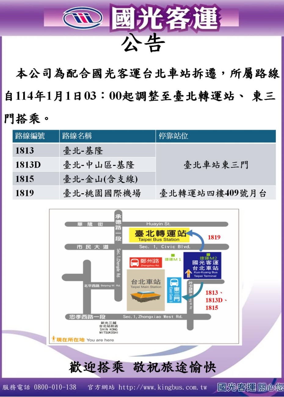 國光客運台北轉運站 409 月台:台北市大同區市民大道一段 209 號 4 樓,05:40-22:40 營業