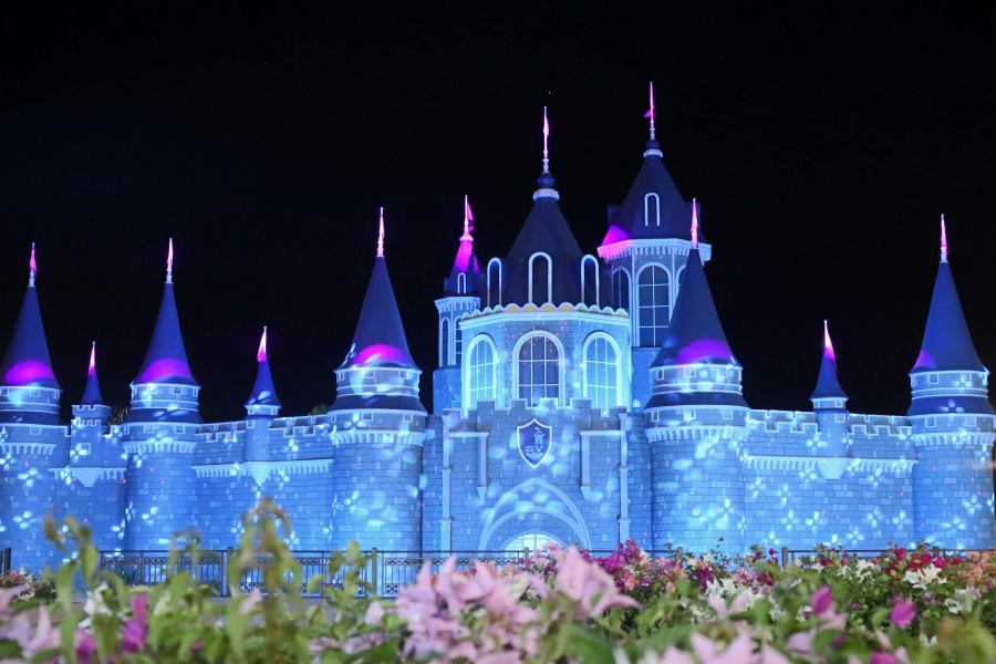 【顏值出片】藍色城堡外觀搭配園內科技光影與主題場景,處處皆為打卡點,搭配塔阿爾湖景觀,拍照紀念超合適。