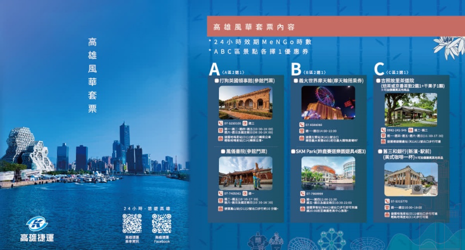 高雄風華套票 MeN Go 24小時數兌換序號 英國領事館/鳳儀書院入館券「二擇一」 吉照故里-橋頭糖廠宿舍茶飲/舊三和銀行-新濱·駅前美式咖啡「二擇一」 SKM Park鈴鹿賽道樂園「遊具四選三」/義大世界摩天輪「二擇一」 高雄樂遊套票 MeN Go 48小時數兌換序號 愛河太陽能船搭乘乙次 SKM Park摩天輪搭乘乙次(需同時二人搭乘) i-Ride KAOHSIUNG飛行劇院門票體驗乙次(限飛越系列) 高雄流行音樂中心常設展入場乙次 駁二展場單展門票(當代館/舊事倉庫二選一)