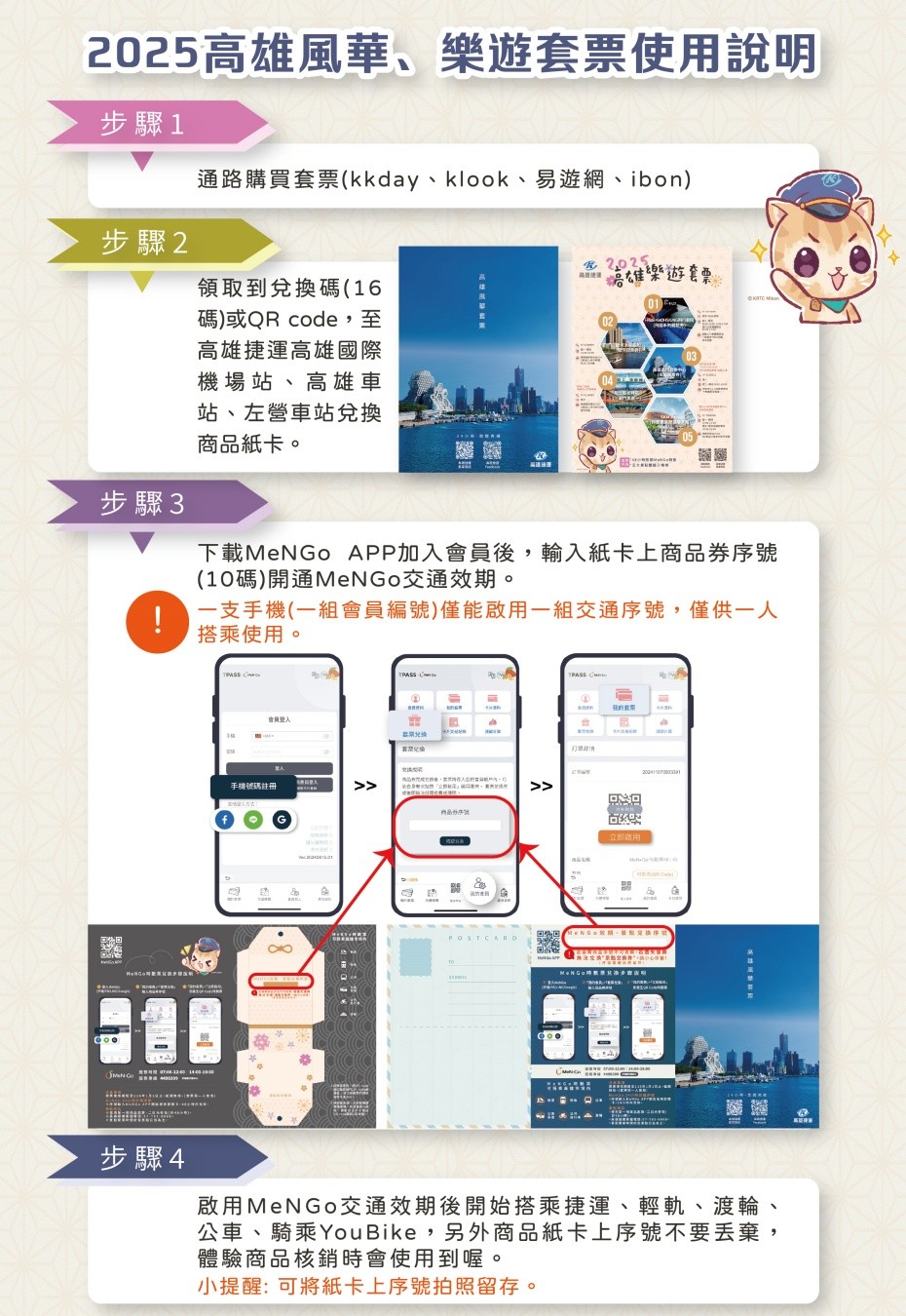 交通運具權益包含:高雄捷運、高雄輕軌、市區公車、公路客運無限搭乘;高雄渡輪 2 次(限鼓山 - 旗津、前鎮 - 中洲航線);高雄 YouBike 2.0 每趟前 30 分鐘免費騎乘(需先完成會員綁定)