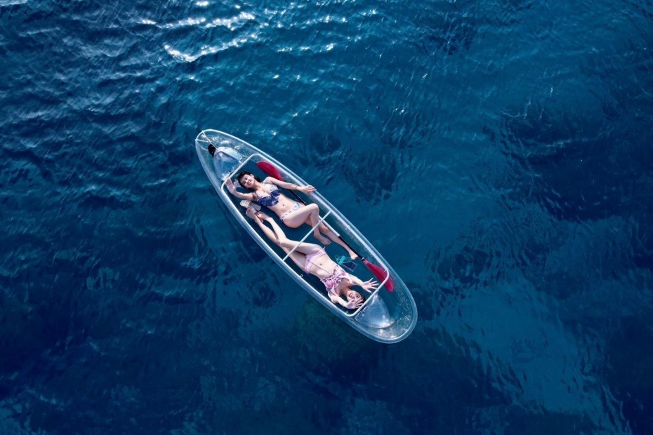 透明獨木舟、槳、救生衣、防曬外套、置物區、盥洗設備