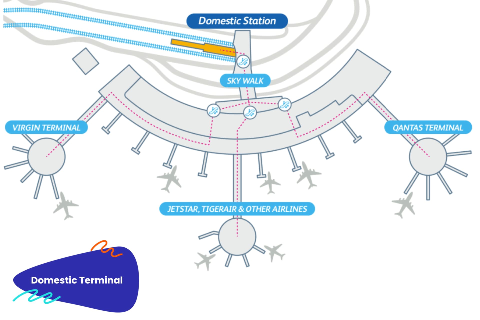 Airtrain路線圖:機場快捷列車 (Airtrain) 位於高架天橋上,可從國內機場正前方的手扶梯輕鬆抵達。我們親切的工作人員將協助您快速前往目的地。