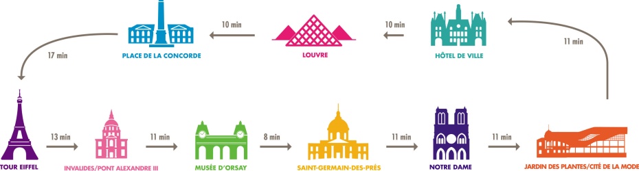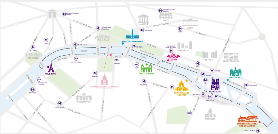 停靠景點:艾菲爾鐵塔、奧賽美術館、聖日耳曼德佩區、巴黎聖母院、植物園、市政廳、羅浮宮博物館、協和廣場