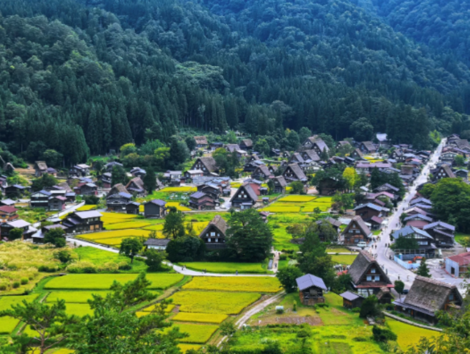 白川鄉四面環山、水田縱橫,涓涓河川流經而過,被稱為森林和溪流的王國。白川鄉荻町的村落是三個被登錄為世界遺產的村落(白川鄉、五箇山的相倉和菅沼)中,戶數最多的村落,有 152 戶。靈峰白山所流出的大白川,與莊川匯合後會變得雪白渾濁,這就是白川鄉地名的由來。城山展望台在白川鄉荻町合掌村的東北部,在這裏,合掌村和綿亙的白山一覽無遺。