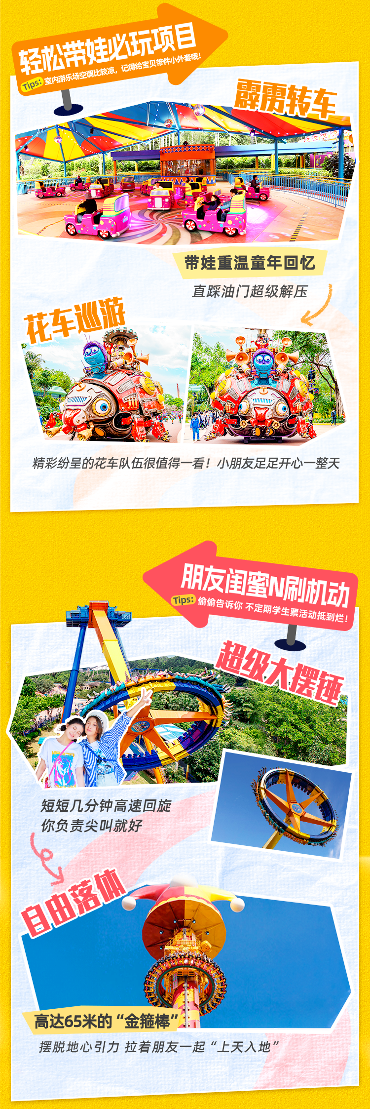 (2)長隆歡樂世界:可尊享提前至少半小時入園體驗;搶先體驗碰碰車、夢幻轉馬、空中警察、飛虎隊設施;入園通道:歡樂世界北門;具體開園時間以園區當日公告為準