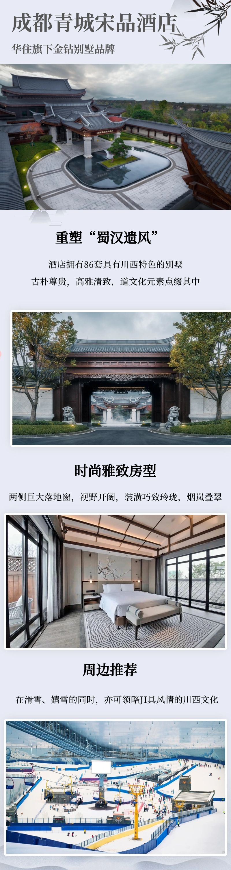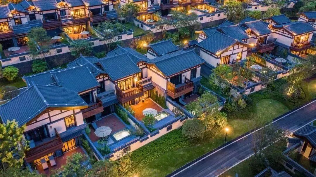 對“蜀漢遺風”的一次現代重塑,傳承雅奢生活方式一座具有古典風韻,又別具川西浪漫情懷的度假酒店酒店擁有86套具有川西特色的別墅古樸尊貴,高雅清致,道文化元素點綴其中