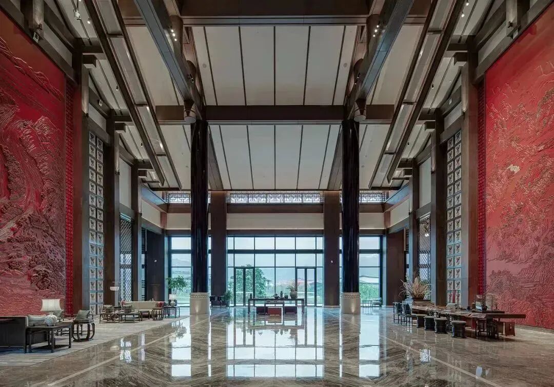 酒店大堂以杜莆草堂為構架結合蜀漢遺風營造質樸、大氣、氣勢恢宏的空間感