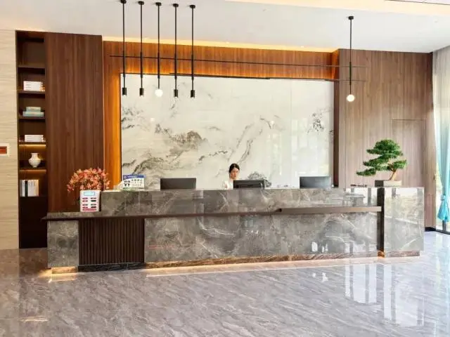 酒店前臺采用大理石為主材,與背後的深色木板搭配,形成一種沉穩莊重的感覺。位於正中央的水墨畫,則以簡潔的風格烘托出酒店那別具一格的高雅和情調。