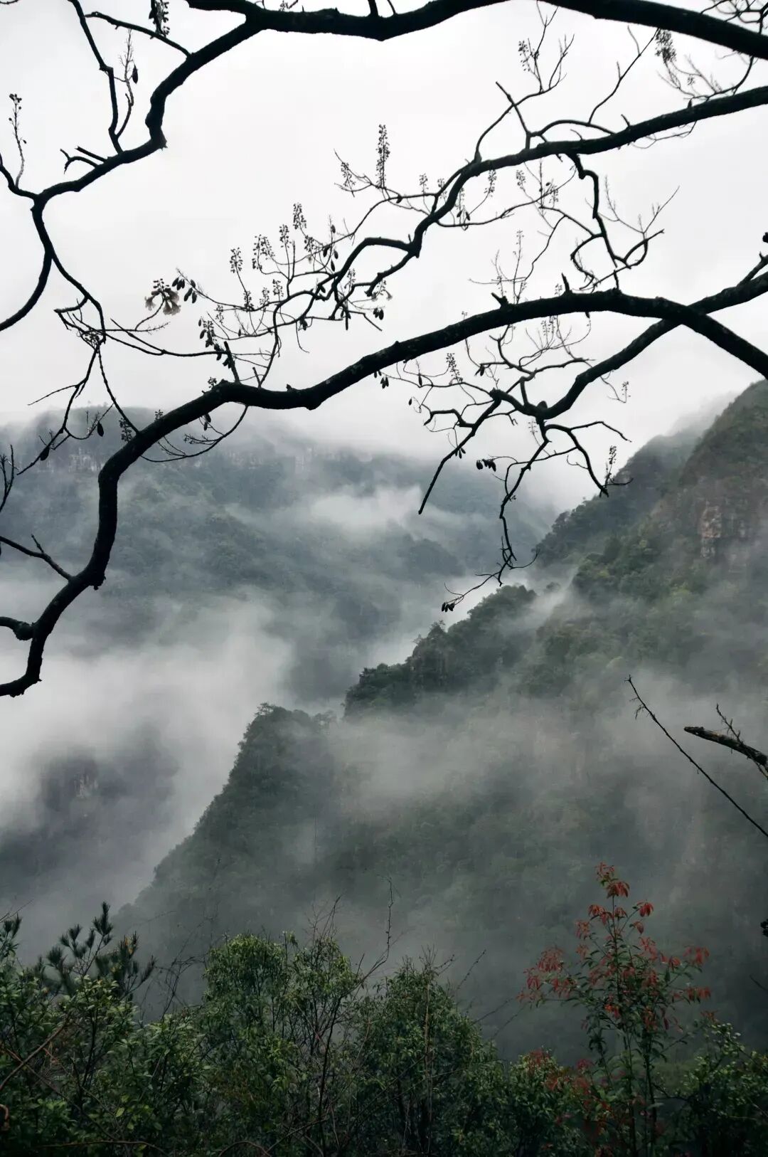 谷內峰巒若隱若現如水墨畫一般的意境,妙啊!