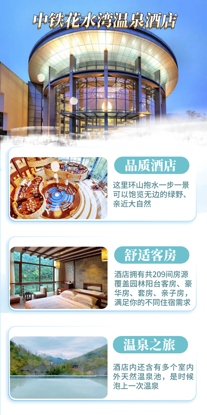 中鐵花水灣溫泉酒店佔地109畝,綠化覆蓋率85%依山傍水的私密環境是花水灣最佳沒有之一全家老小在酒店,可以享受到閑適安靜的假期
