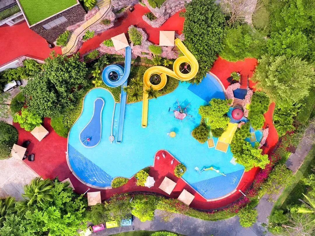 酒店擁有兒童戶外水樂園和兩個大泳池,最遠的是一個接近圓形的泳池,中間是環形池,這兩個休閑泳池不僅可以暢遊,還可以玩水上排球等活動,帶有按摩池。