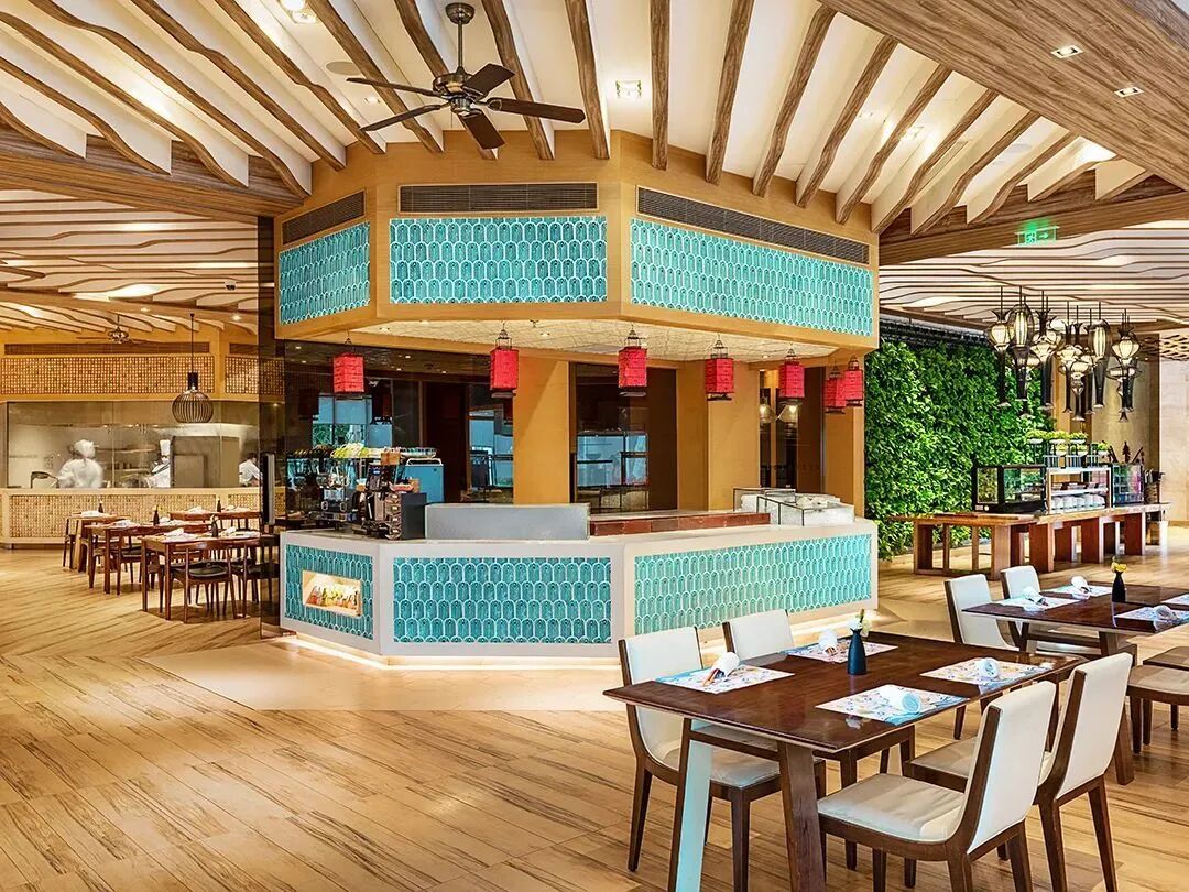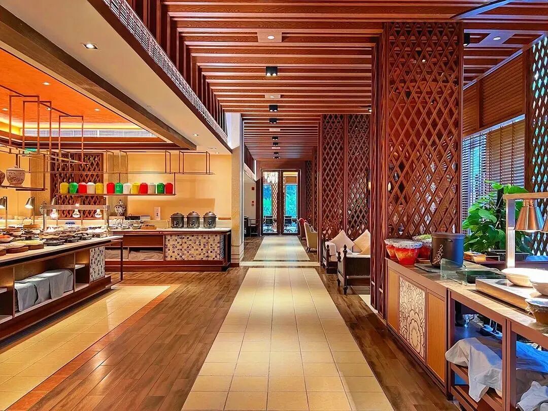▲全日制餐廳·廚藝舞臺全日制餐廳廚藝舞臺則提供每日自助早餐,也可在此單點正餐。早餐甚為豐盛,一早熱菜就很多,除了常規的中西式自助各式甜點水果外,還有多種海南特色餐點,如椰汁、清涼補等,備受客人的好評。