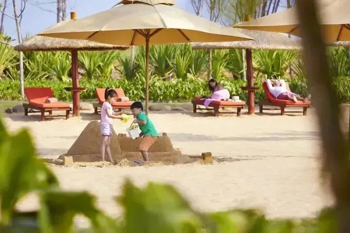 在面積達8590平米的沙海區,不用去沙灘,爸媽躺在棕櫚樹太陽傘下,就能愜意看著寶貝們挖沙!
