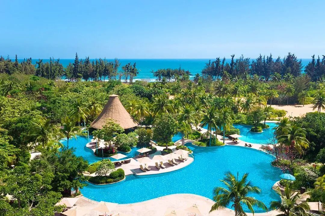 酒店坐擁廣闊園林,蔚藍泳池、繽紛水上樂園、還有茅草屋散落其中。9000多平米的大草坪綿延至海邊,猶如一座小型自然森林公園。酒店內配有隨叫隨到的電瓶車,方便貼心。