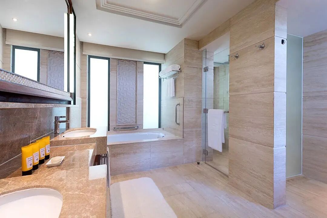 ▲豪華臨海園景房客房配置上也相當貼心:大床房大都配有可拉伸的沙發床,幹濕分離的衛浴間配有浴缸,衛浴品牌選用的是全套toto。帶孩子入住提前告知,客房還會準備好兒童浴袍、兒童拖鞋、兒童洗發水、沐浴露、潤膚乳等。