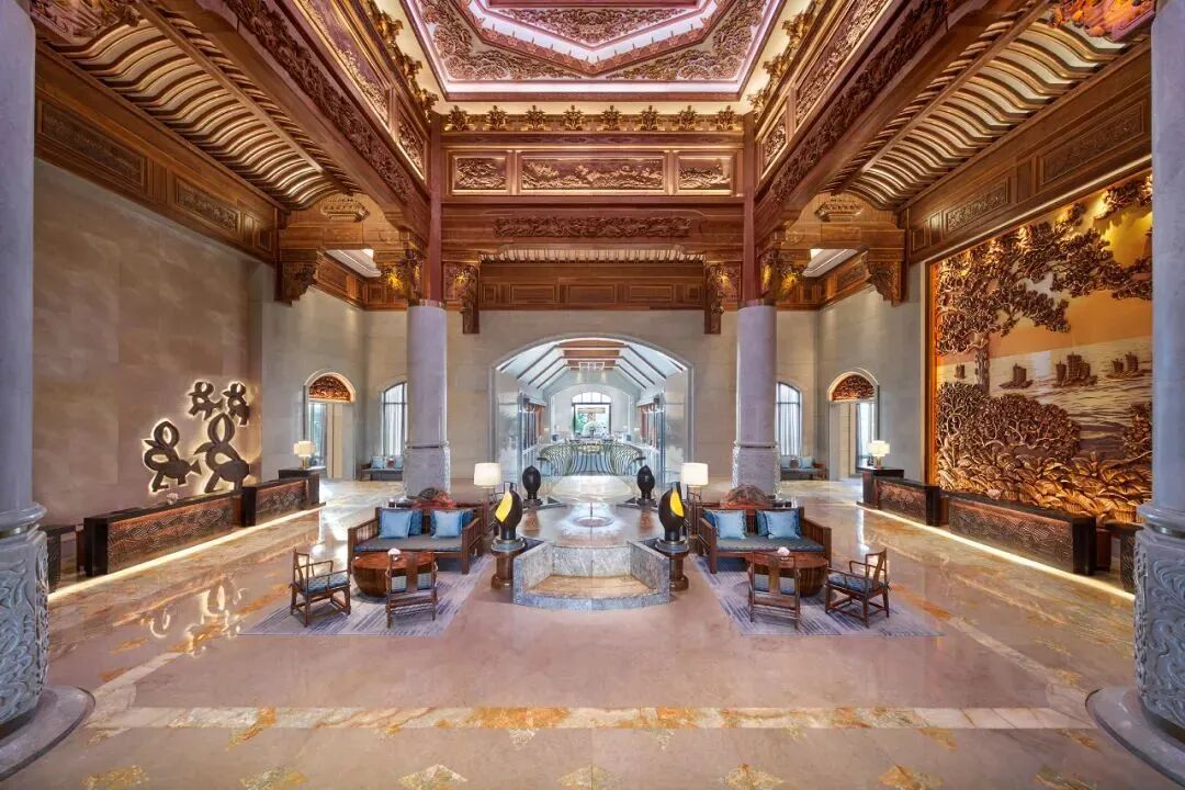 當古建築風情、海島風結合,能碰撞出怎樣的化學反應?我想三亞海棠灣熹棠費爾蒙酒店可以給你答案。文化底蘊是真得深。去到酒店大堂check in,需要穿過段充滿江南韻味的廊橋。隨處可見酒店運用了紫檀、酸枝、楠木等名貴珍稀木材等3000余噸,以首批國家級非物質文化遺產代表作——東陽木雕為工藝,處處有典故,處處經得起推敲,成為酒店的吸睛法寶之一。