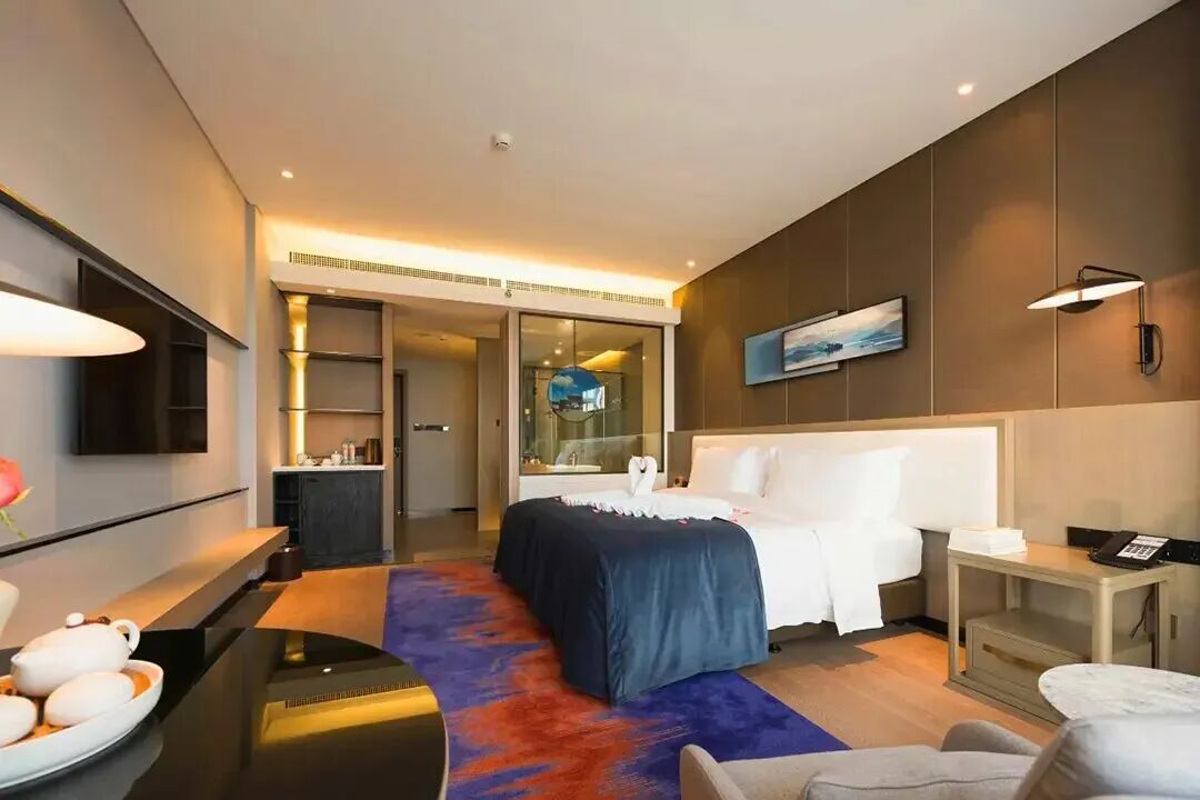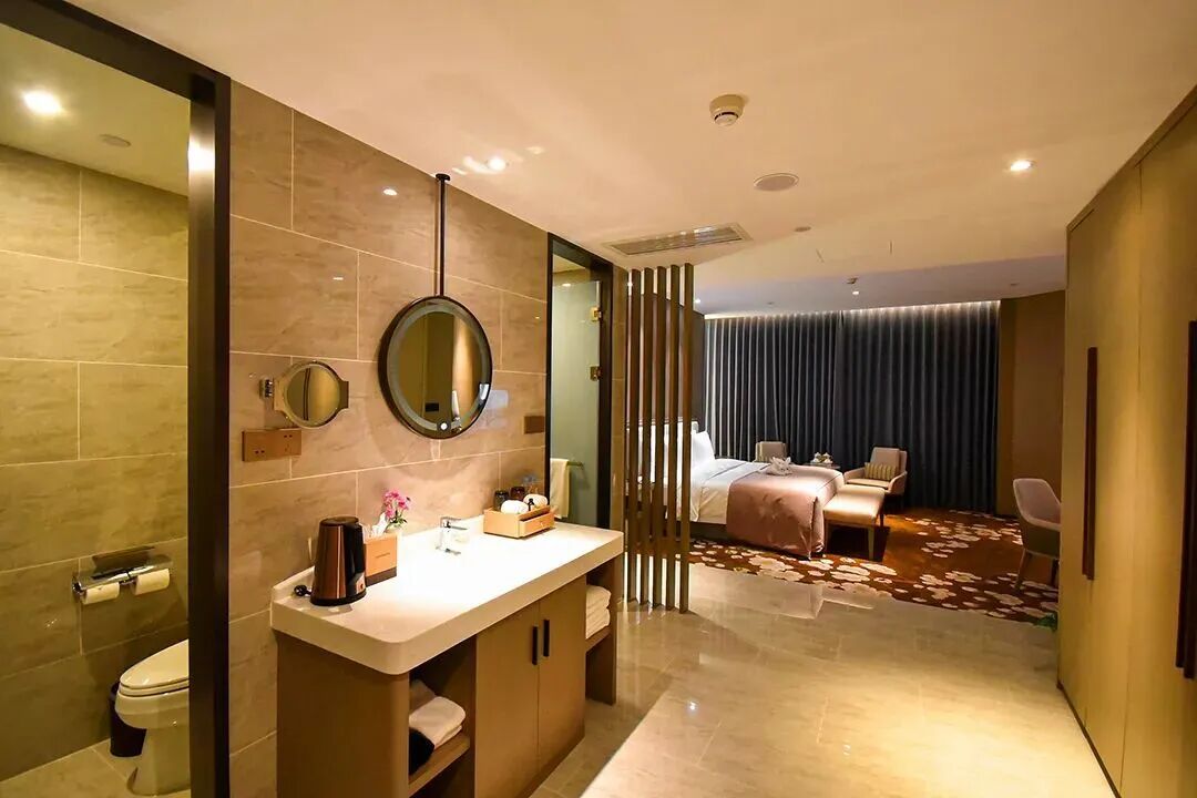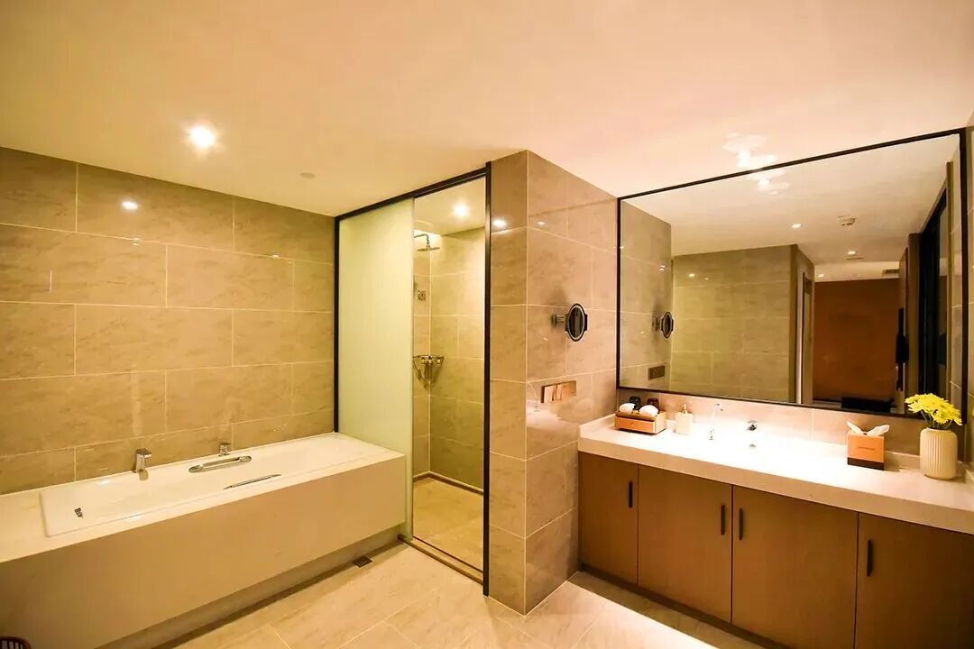 客房采用傳統與現代設計理念的融合,高品質的同時,配套一應俱全,衛浴間皆幹濕分離,套房還配有浴缸。